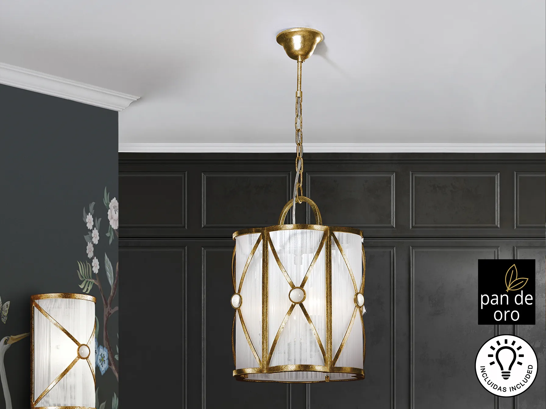 Лампа с 3 светлини, изработена от метал с остарял златен финиш. Декорацията от стъкло и бял конец придава елегантен вид на осветителното тяло.