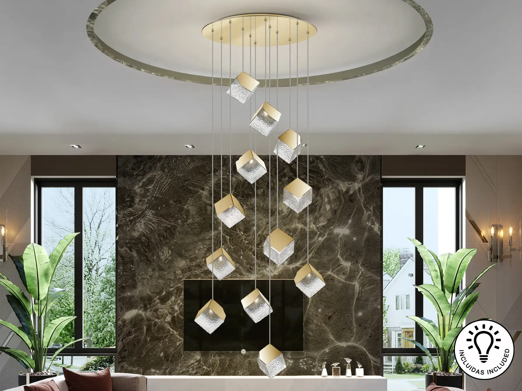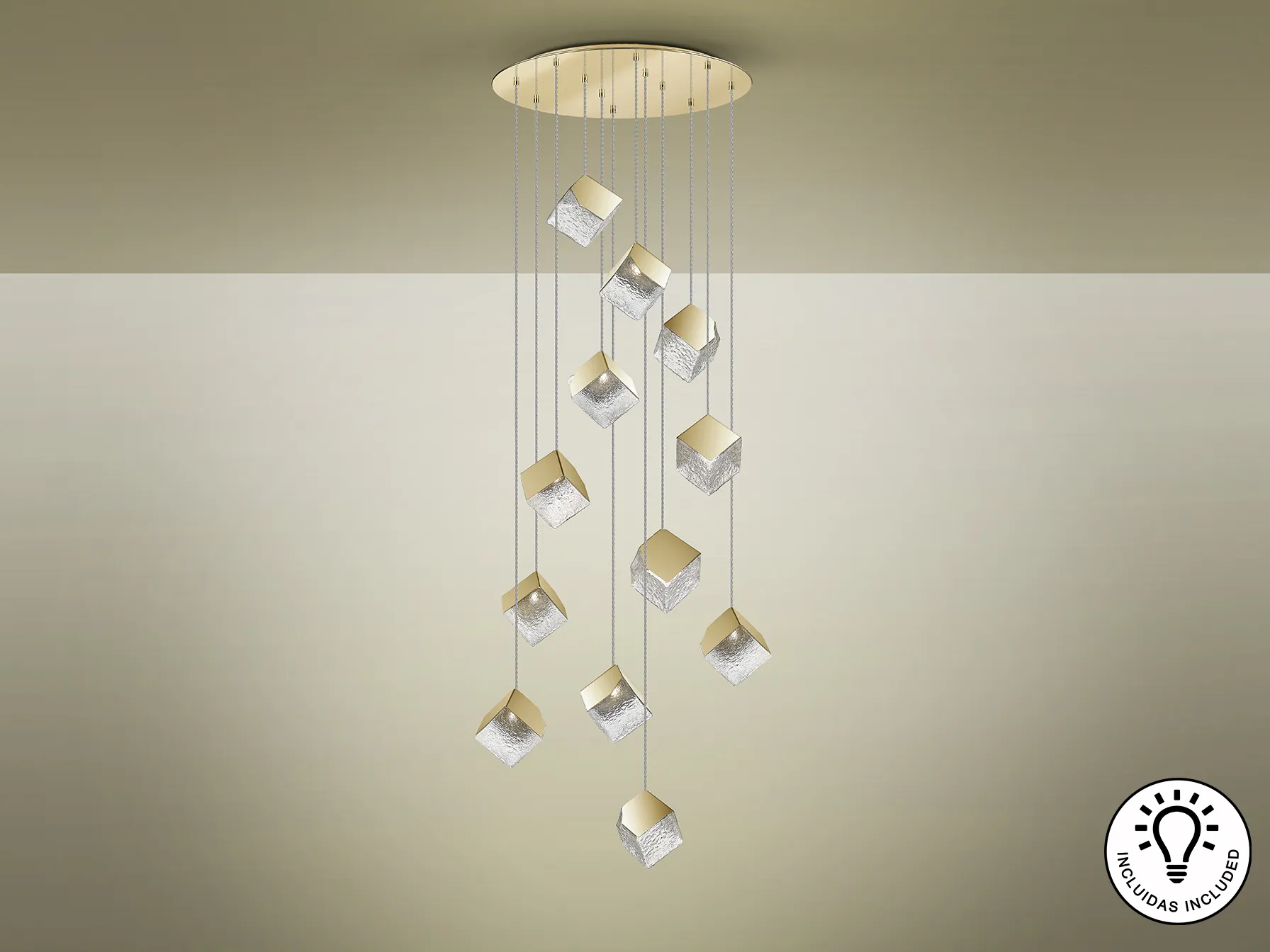 Кръгла лампа с 12 светлини, изработена от метал и стомана с златно покритие. Има кубична абажур от текстурирано стъкло и е регулируема по височина.