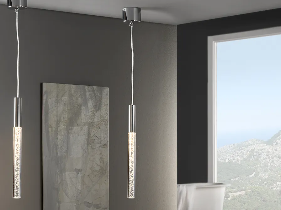 Висеща лампа с 1 LED осветително тяло. Изработена от метал с хромирано покритие и прозрачен акрилен бар с балончета вътре.
