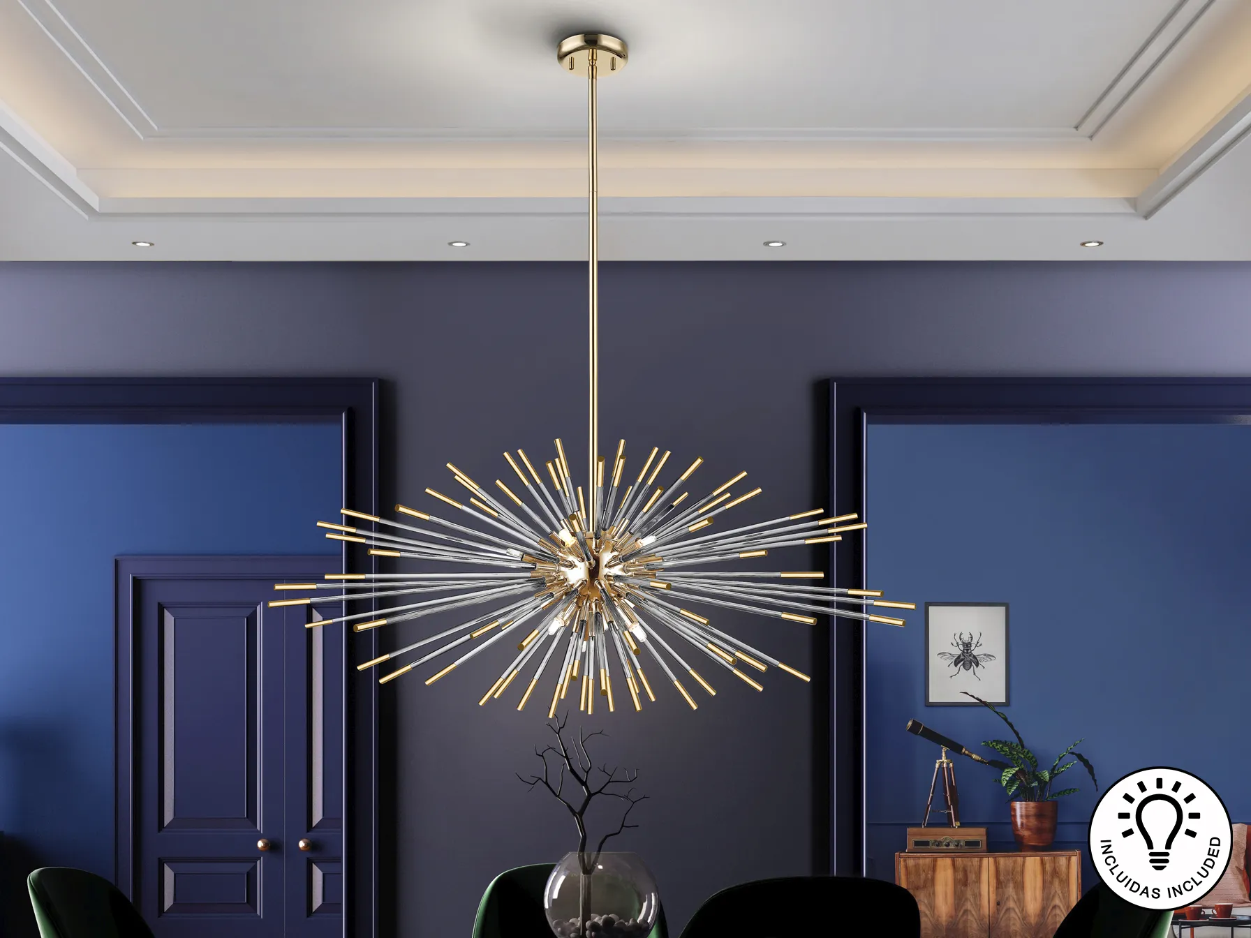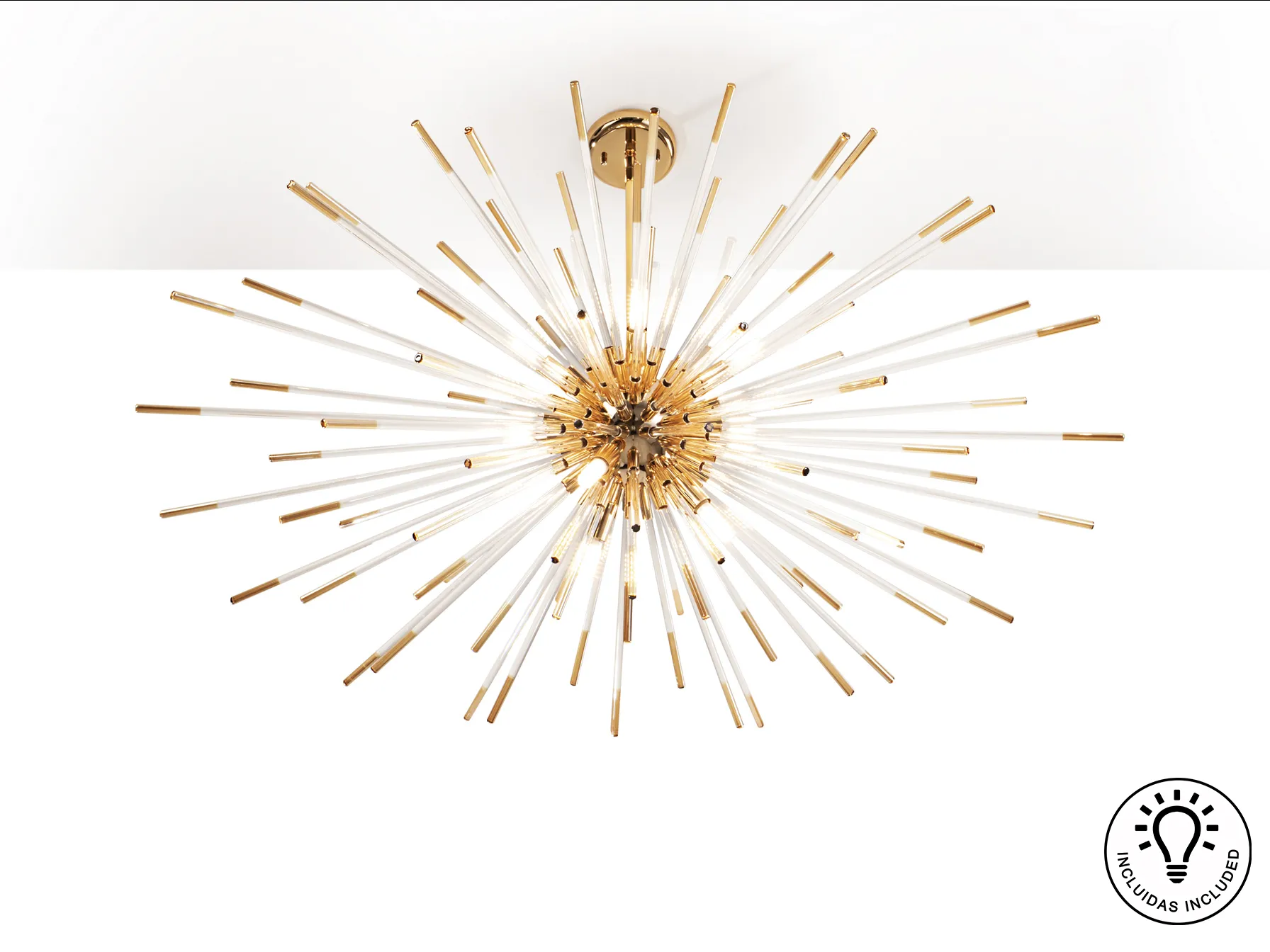 Сферична лампа, изработена от метал и завършена в ярко златно. Прозрачни стъклени радиални пръти с декорации в кехлибар. Регулируема дължина.