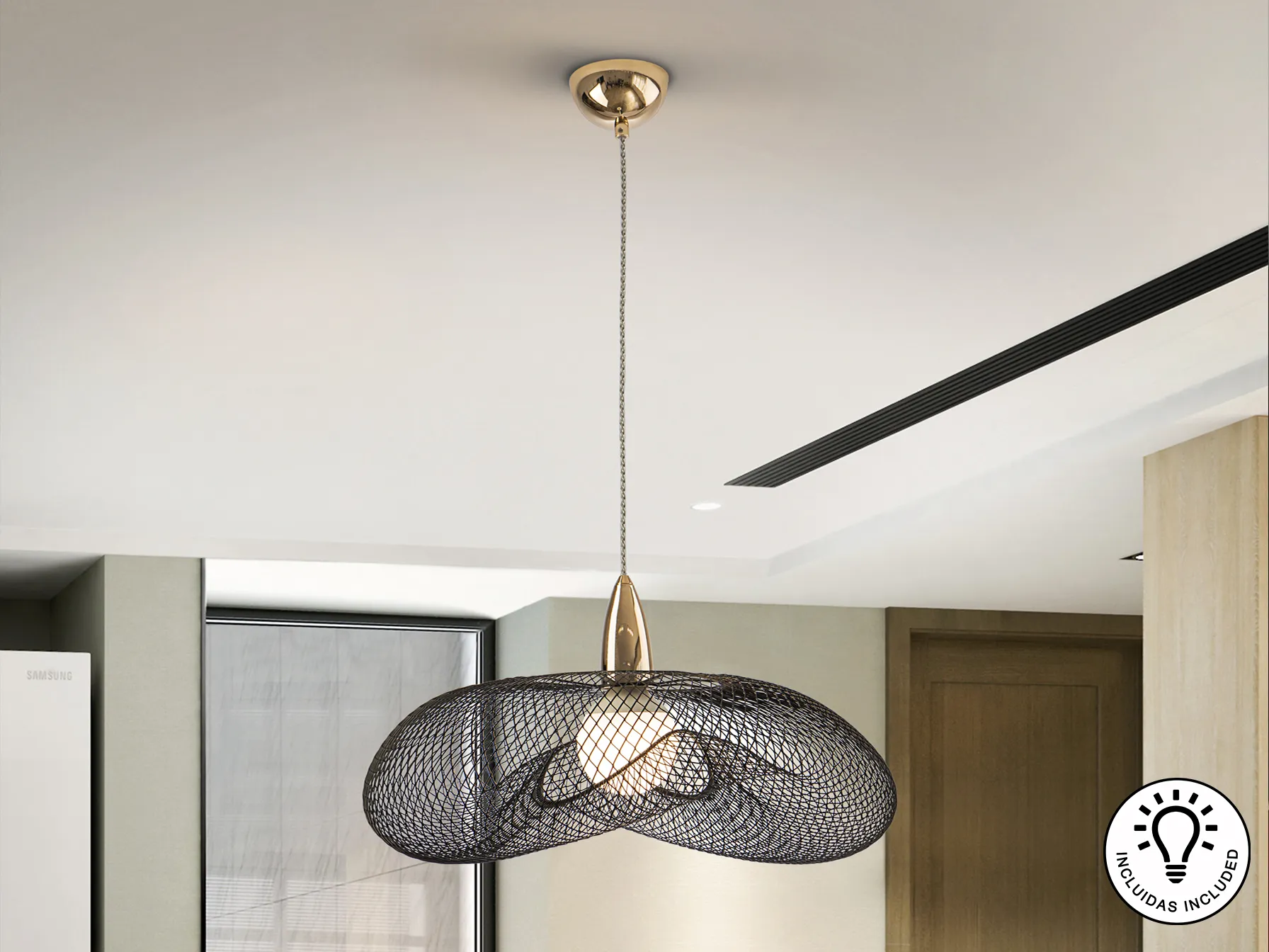 Тази лампа е не само функционална, но и стилна, което я прави идеален избор за всеки интериор. Златното покритие и черната мрежа създават интересен контраст, който привлича вниманието.