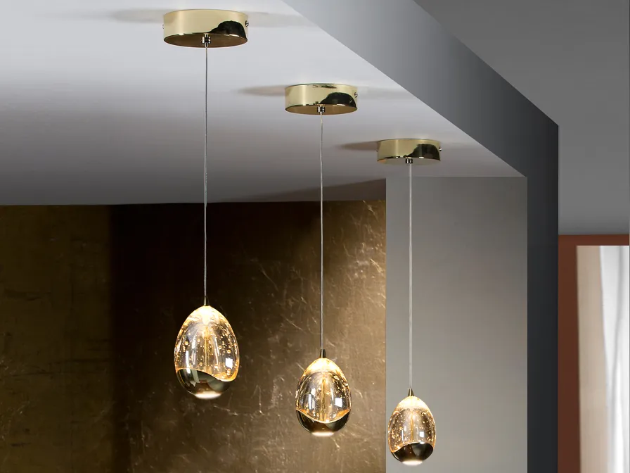 – **Абажур:** Стъклен с капковидна форма и декоративни мехурчета