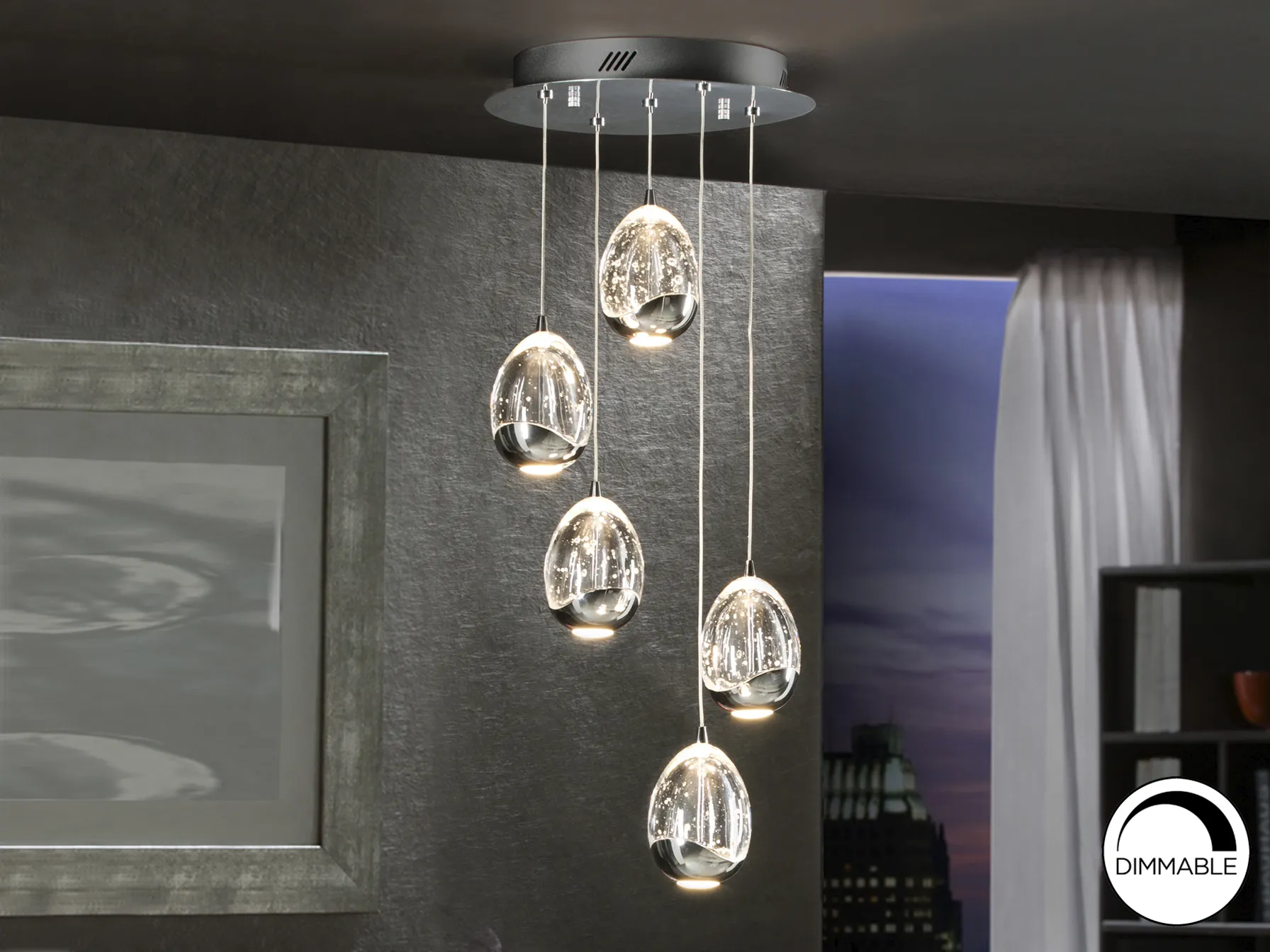 Изработена от метал с хромирано покритие, лампата е не само функционална, но и естетически привлекателна. Стъклените абажури придават уникален вид с капковидната си форма и декоративните мехурчета. Регулируемата височина позволява лесно адаптиране към различни пространства.