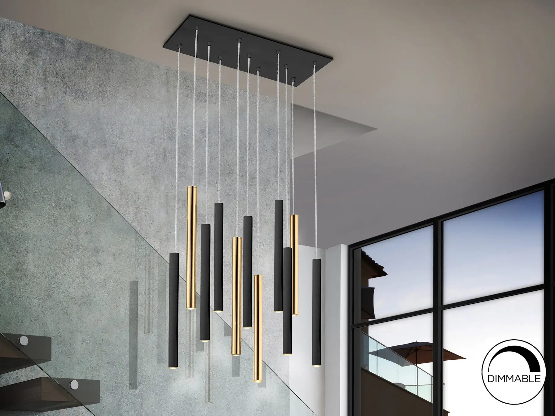 Лампа с 11 LED светлини, изработена от метал с покритие в златен и матов черен цвят. Оснащена с опалова акрилна дифузерна система.