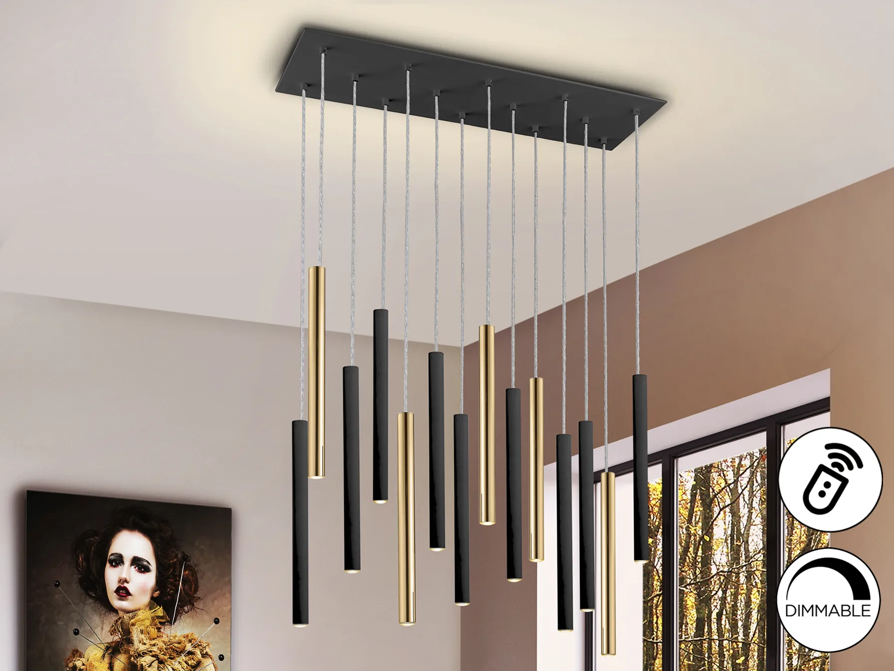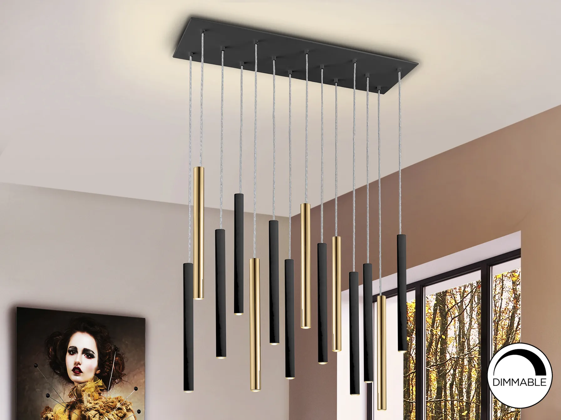 Изработена от метал с елегантно златно и матово черно покритие, лампата е перфектно решение за всяко модерно пространство. Опаленият акрилен дифузер разпределя светлината равномерно, създавайки уютна атмосфера.
