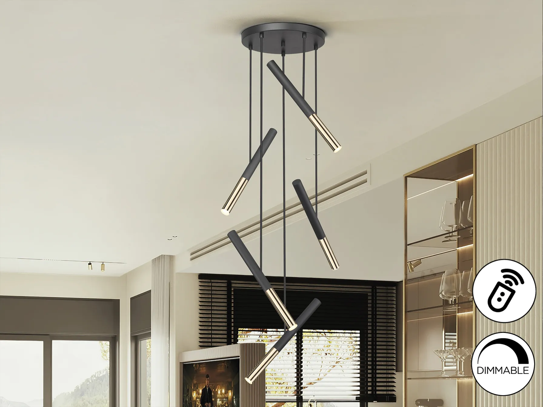 Лампа ЕДНА е стилно осветително тяло, което добавя елегантност и функционалност на всяко пространство. Със своето матово черно и лъскаво златно покритие, тя е идеален избор за модерни интериори.
