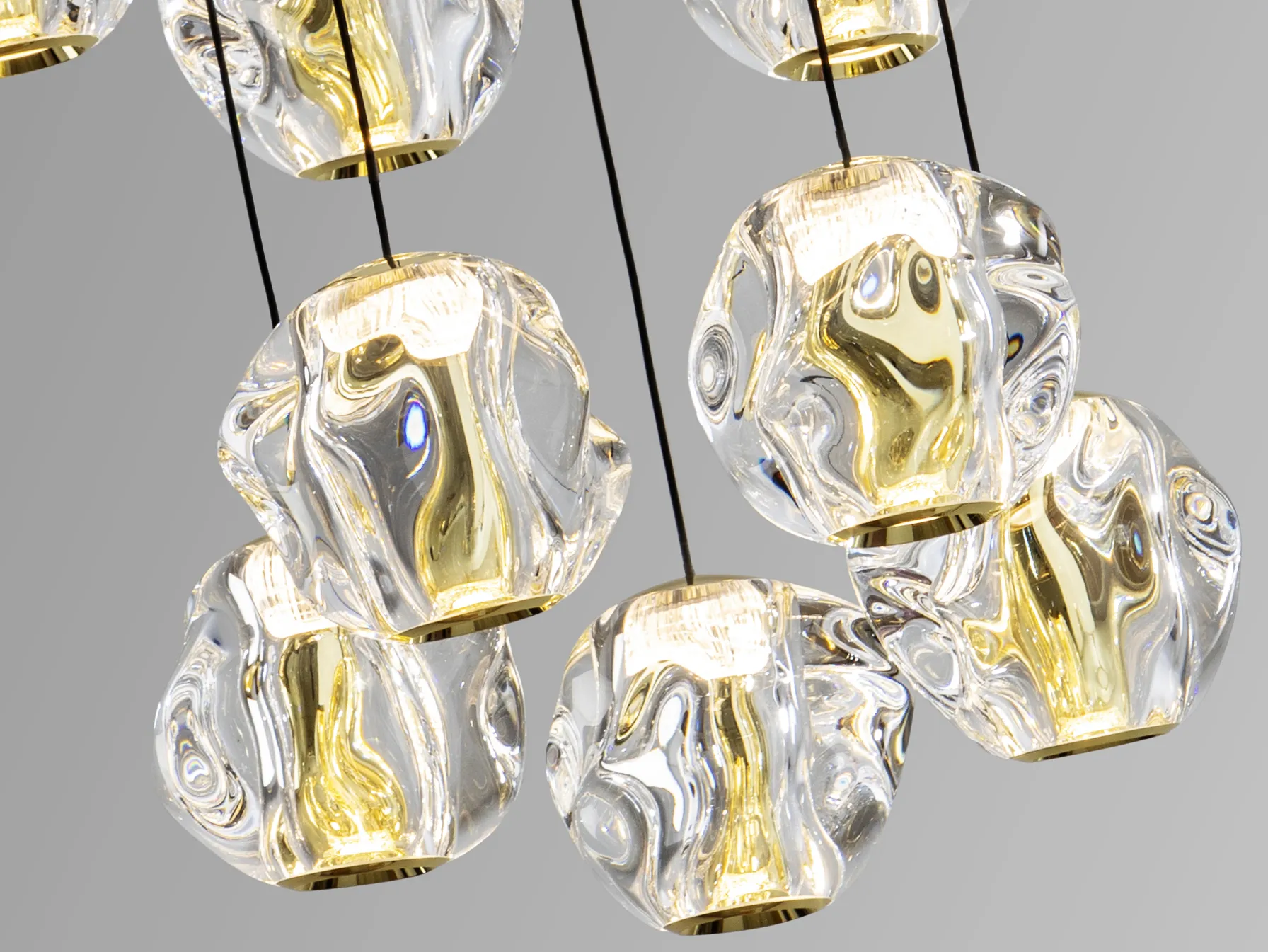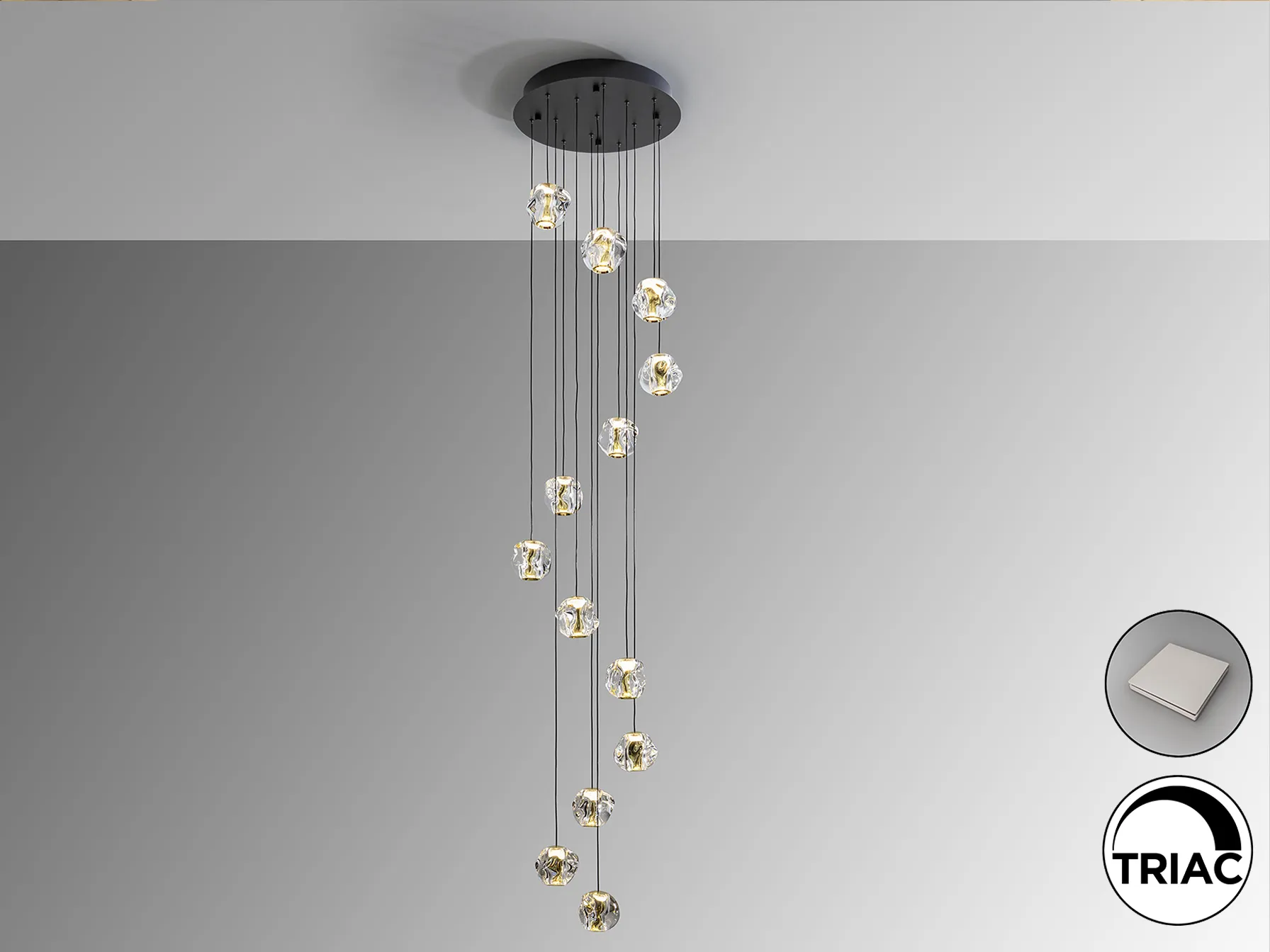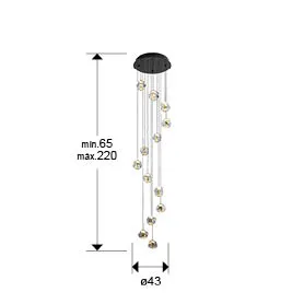 Лампа с 13 светлини, изработена от метал с матово черно покритие и златни детайли, както и прозрачни акрилни абажури. Идеална за съвременни интериори.
