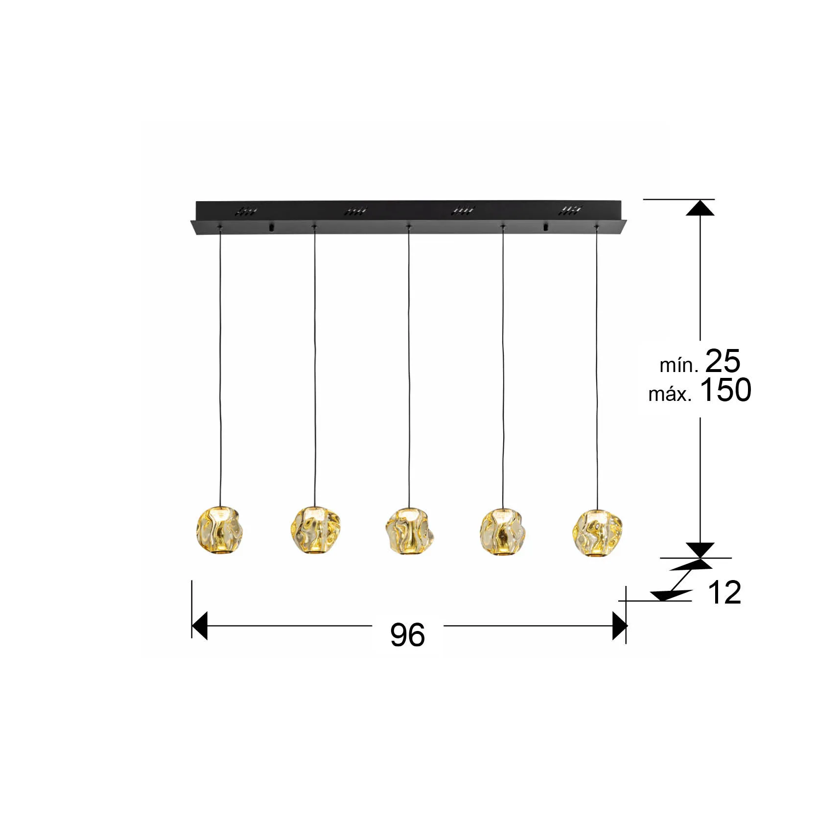 Лампа с 5 осветителни тела, изработена от метал с матово черно покритие и бронзови детайли. Янтарените акрилни абажури осигуряват уютна атмосфера и са идеални за всяко пространство.