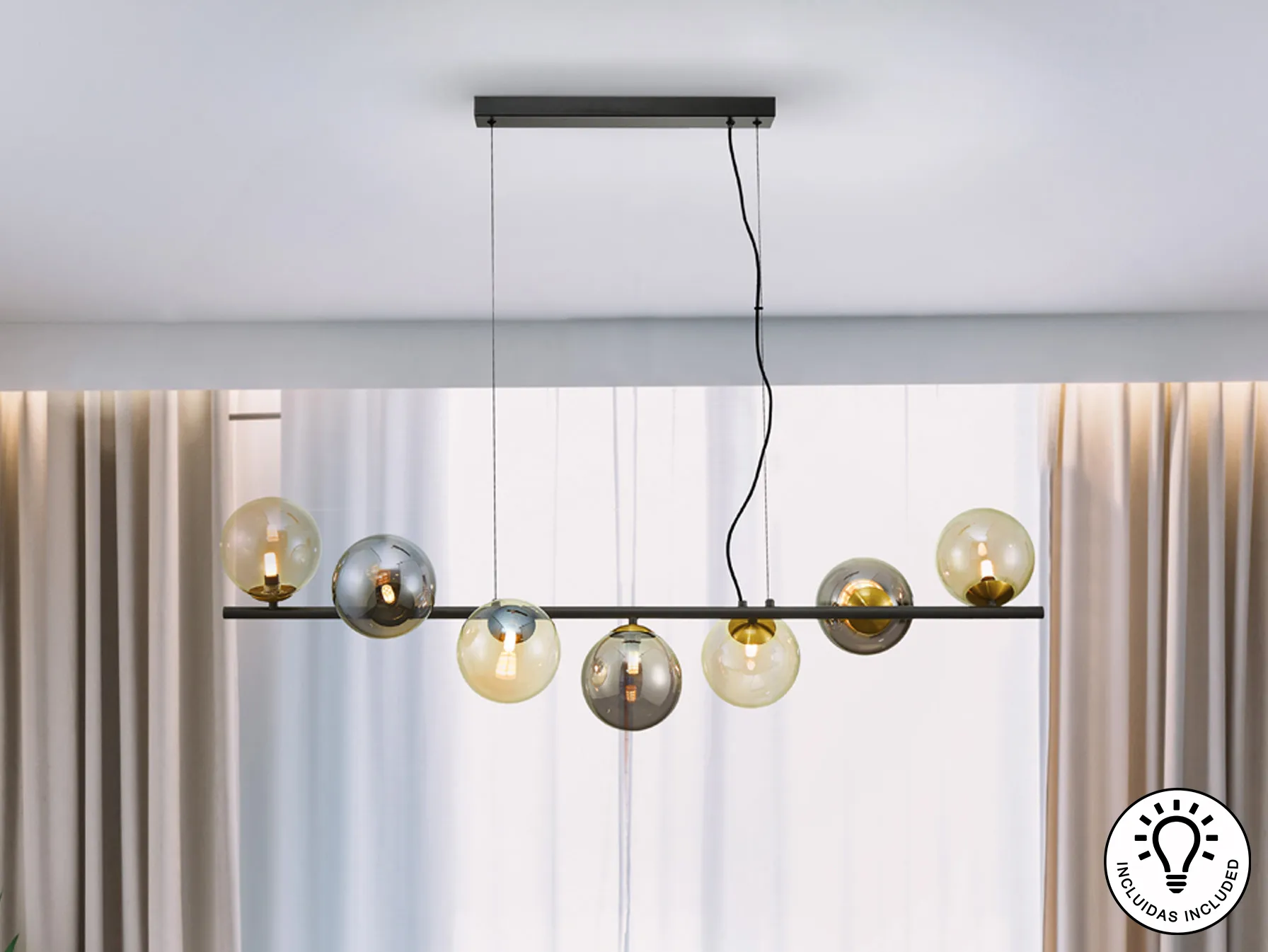 Лампата INOA 7L е стилно осветително тяло, изработено от метал с матово черно и сатенено месингово покритие. Сферичните абажури в янтарно и димно сиво добавят елегантност и модерен вид.