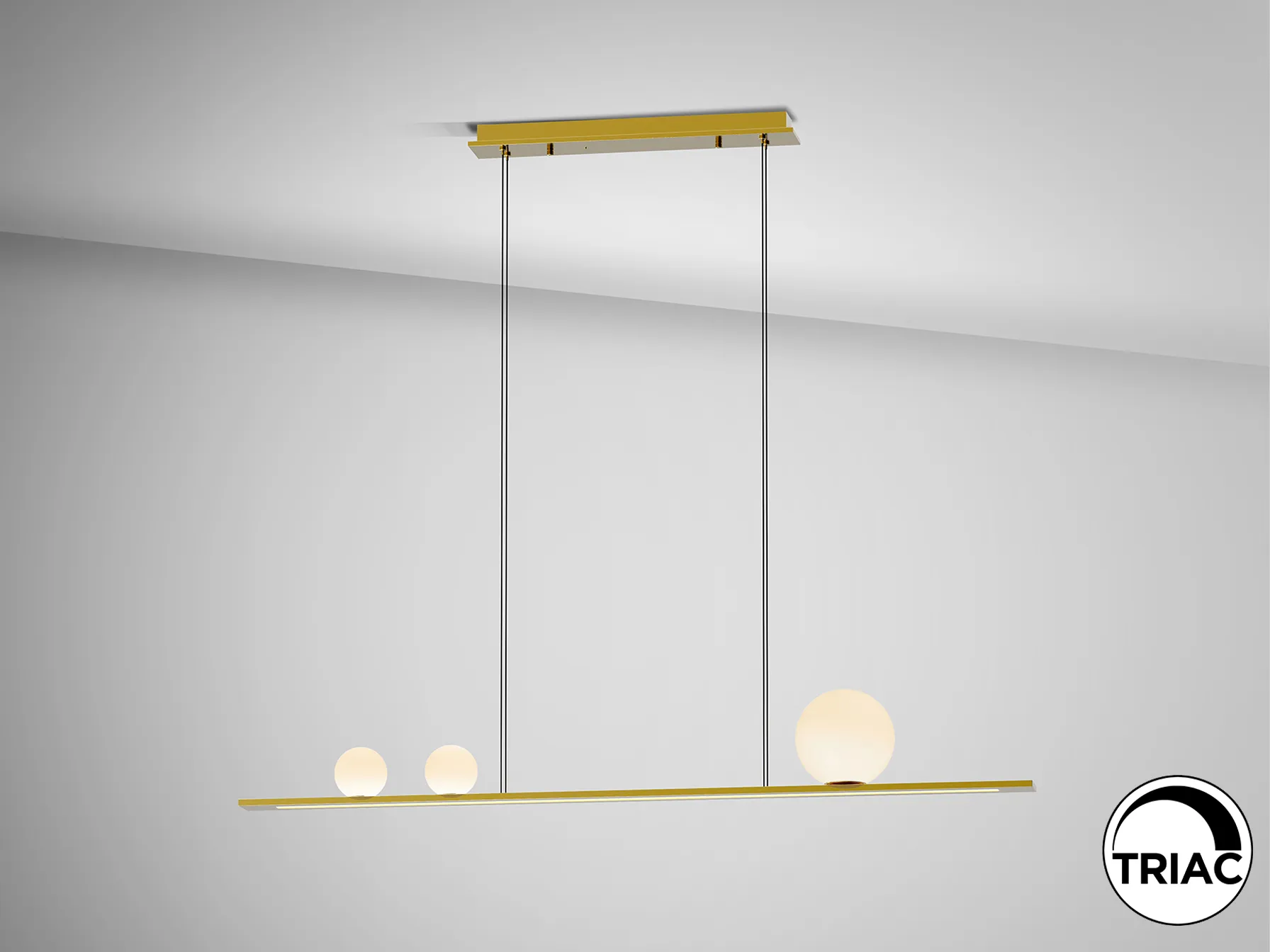 Златната лампа Мила е изработена от четкан алуминий с елегантно златно покритие. С три сферични стъклени абажура в нюанси на бяло и долен дифузер от опалова акрилна смола, тя предлага стилно и ефективно осветление.