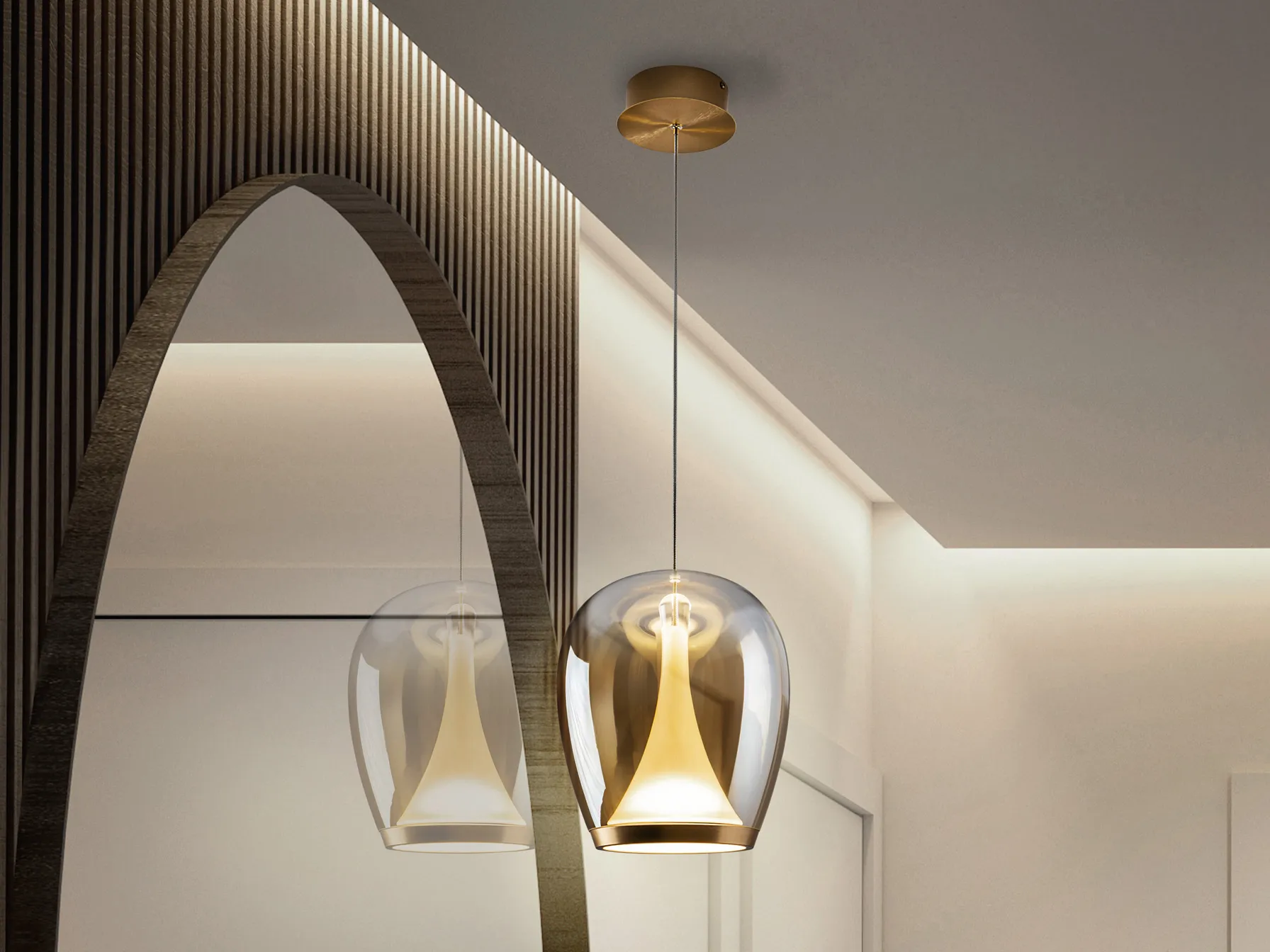 Лампата Суспиро е изработена от анодизиран златист алуминий с абажур от стъкло в градиентен янтарен цвят и опален вътрешен дифузер. Регулируема по височина, тя предлага стилно осветление за всеки интериор.