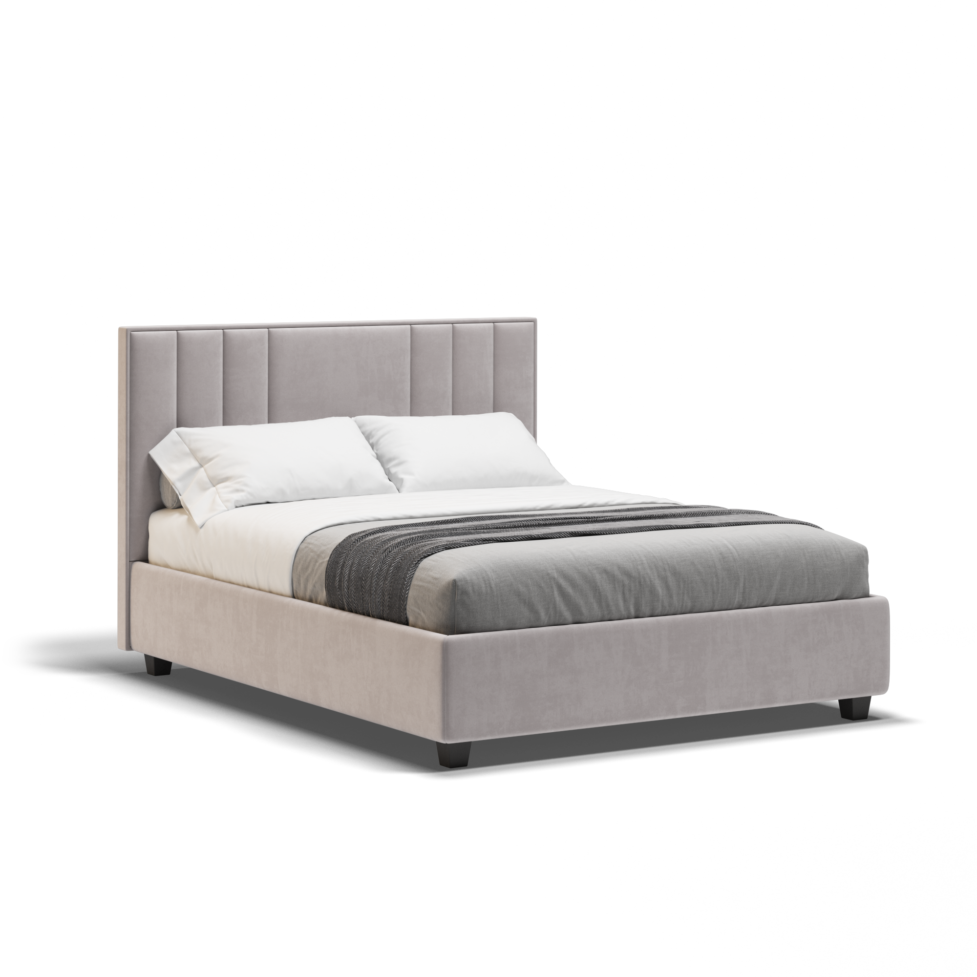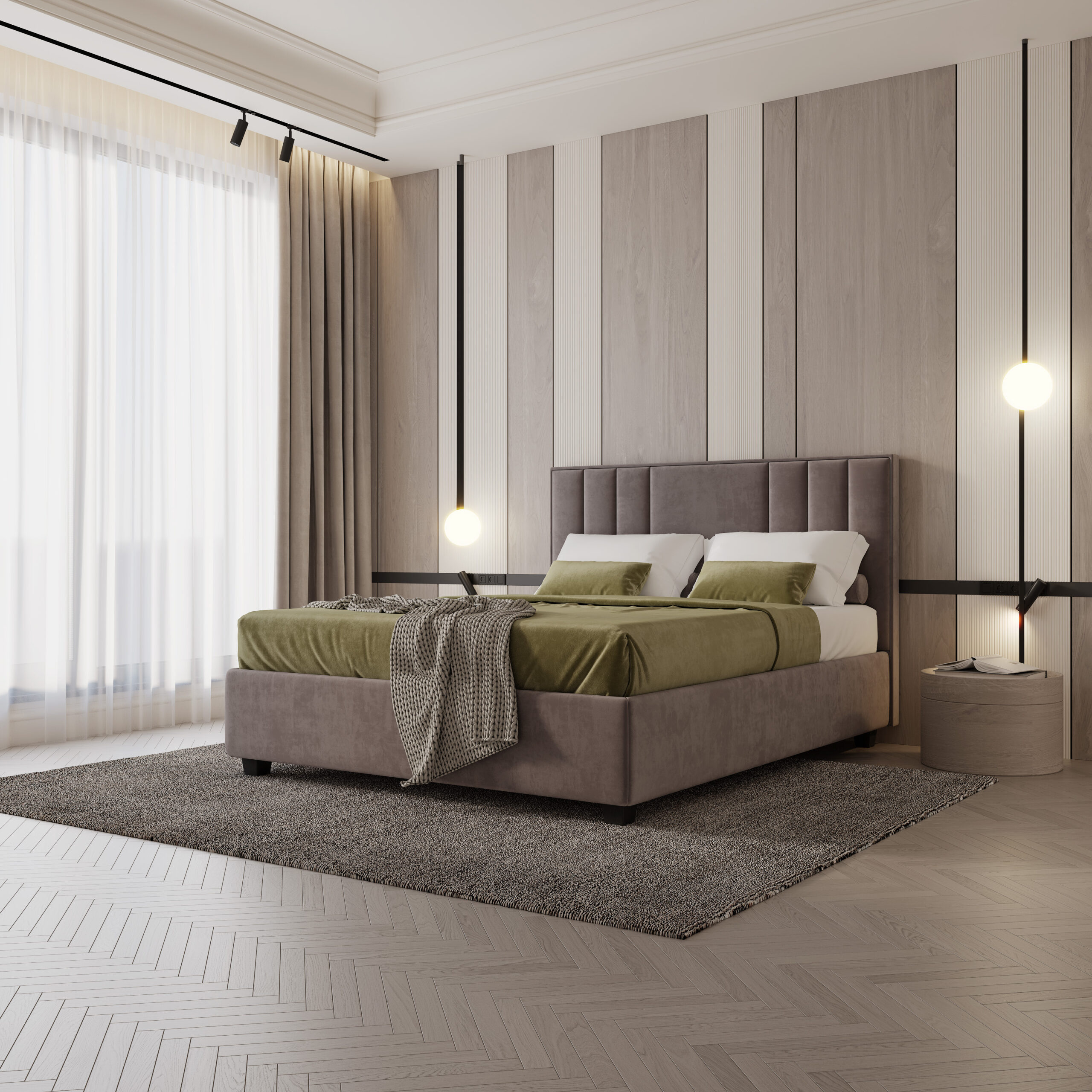 Таблата на леглото Aspen е неговият определящ елемент: вертикална, пропорционална, с ритмичен дизайн от широки панели, които добавят усещане за височина и визуален ред. Чистите линии, добре премислената геометрична форма и компактната основа създават цялостен, модерен силует, който се вписва лесно във всеки съвременен интериор. Леглото се откроява дискретно, но категорично.