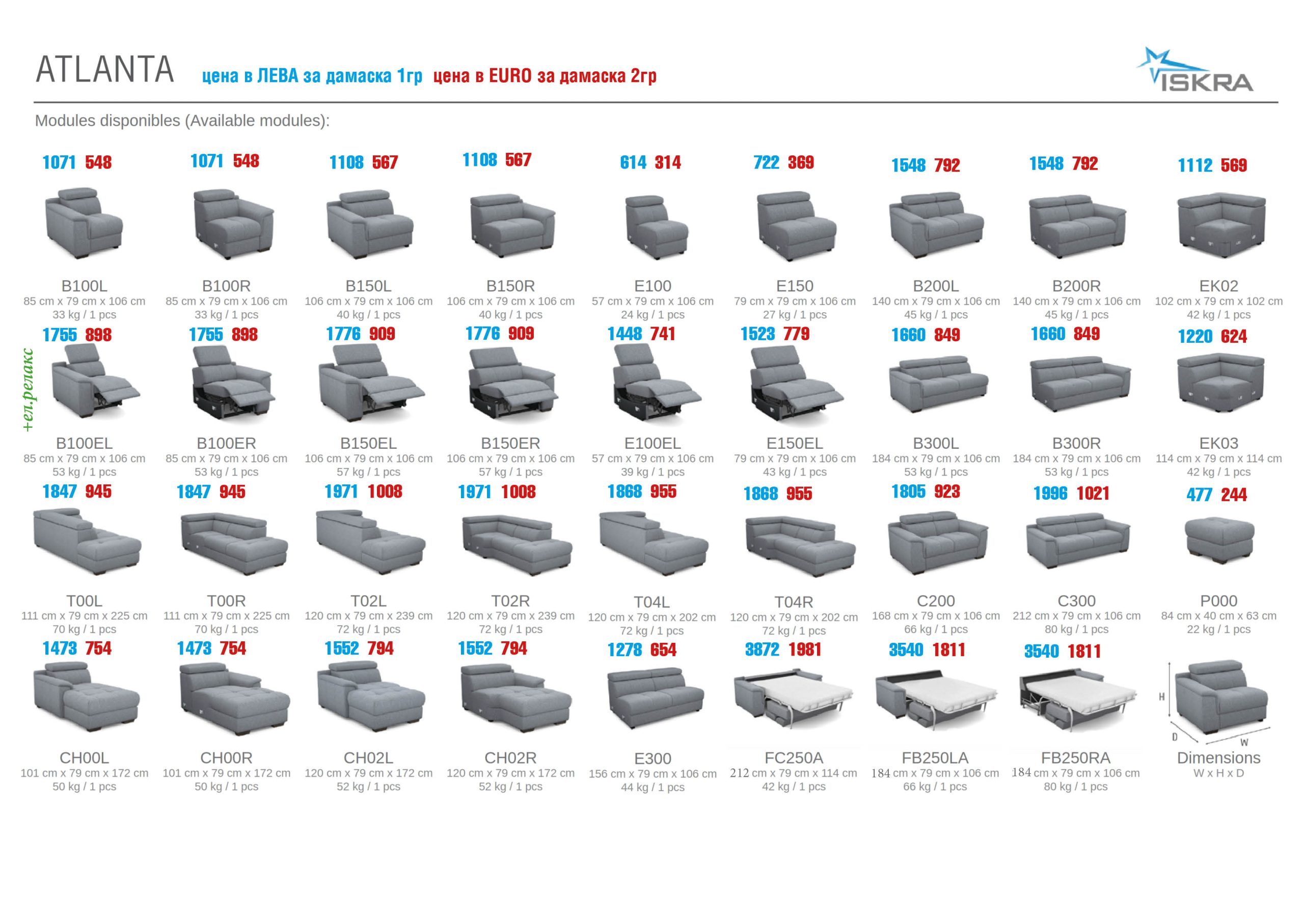 Създайте своя идеален уют с модулния диван ATLANTA! Гъвкав, стилен и удобен, той се приспособява към пространството ти и предоставя максимален комфорт. С висококачествени материи и модерен дизайн, ATLANTA е перфектният избор за всеки дом. Конструкция със зигзагообразна арматура, надградена със сандвич панел с високоеластична пяна с различни плътности и омекотяване допринасят за уникалния комфорт на тази мека мебел. Обърнете се към нашите консултанти, за да ви направят конфигурация по ваш вкус и размер.