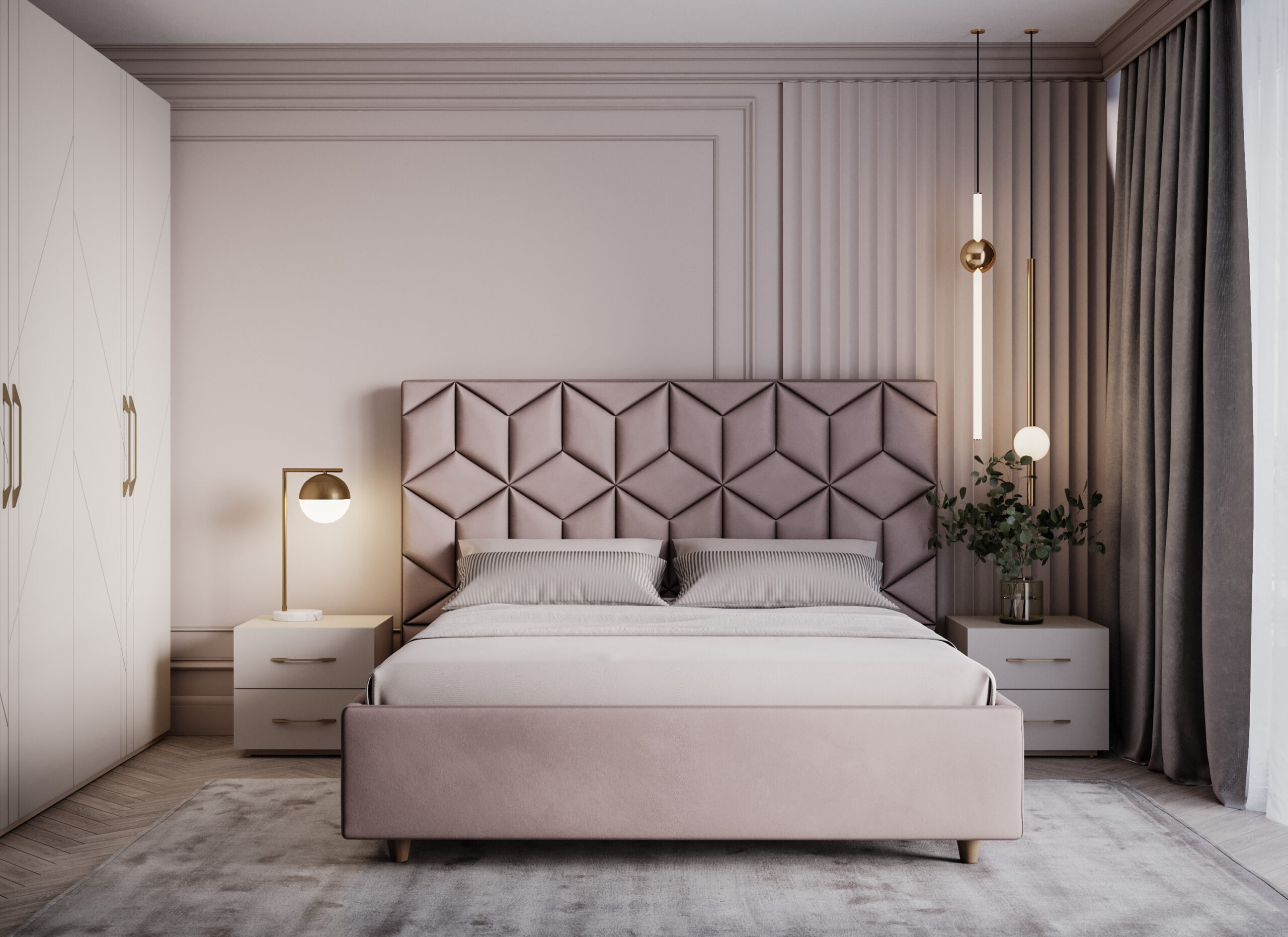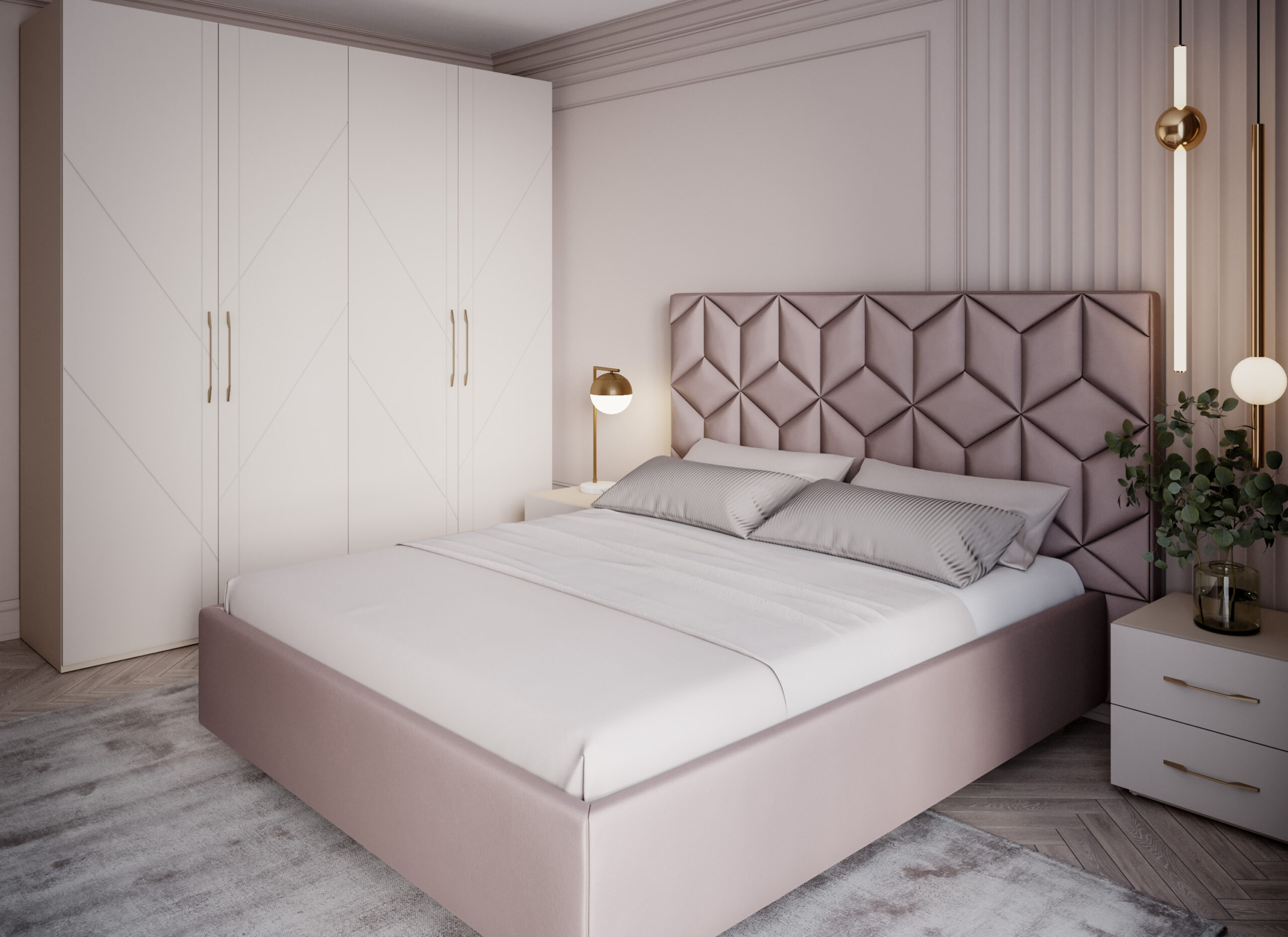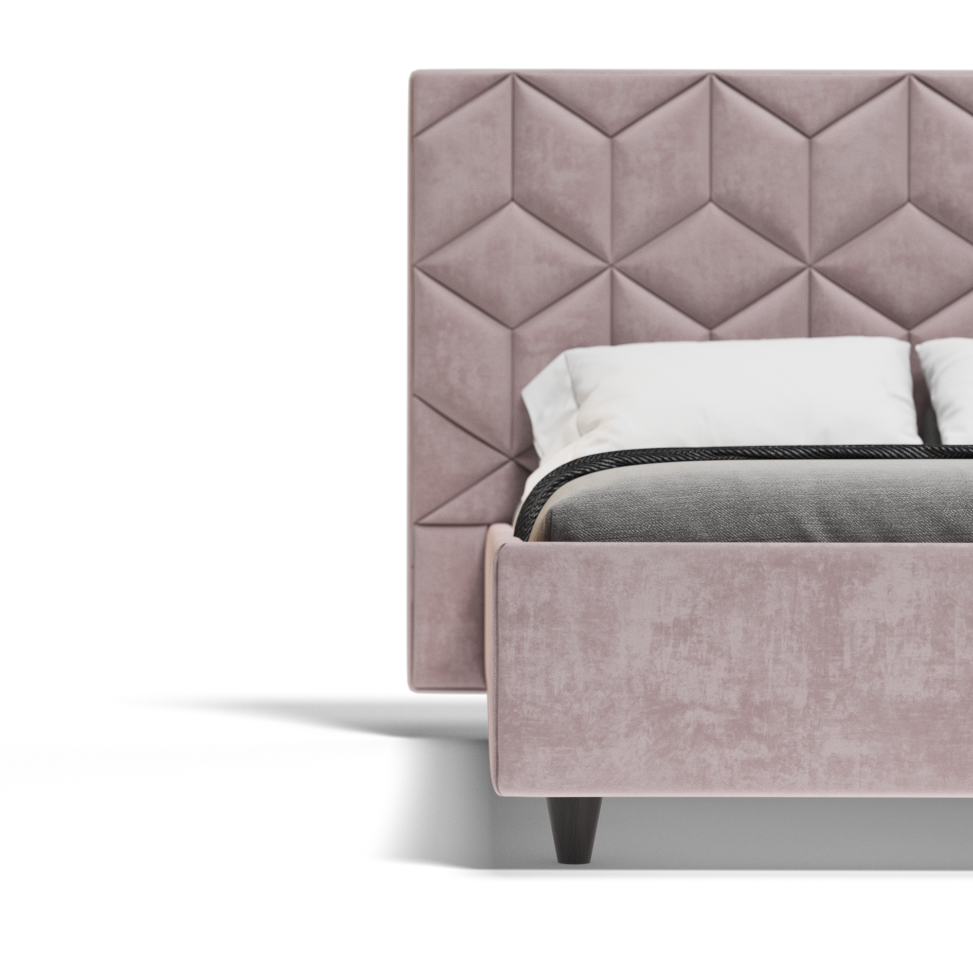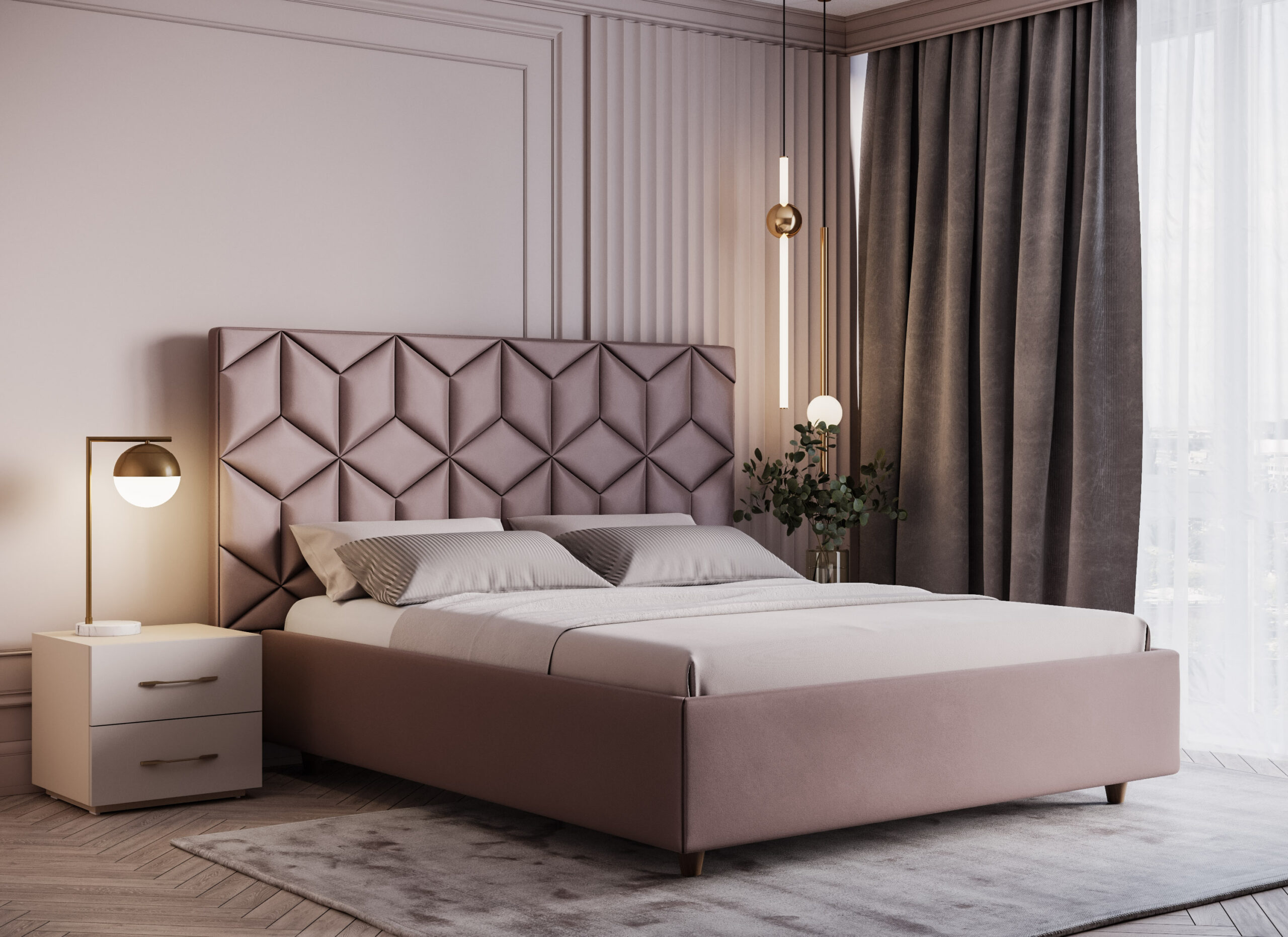 Високата табла на леглото Grace е оформена от релефни панели с геометрична структура от призматични ромбове, които създават впечатляващ триизмерен оптичен ефект. Прецизните шевове и ясно очертаните ъгли придават дълбочина и визуална динамика, превръщайки леглото в характерен архитектурен акцент. Дизайнът е чист, добре ритмиран и внася индивидуалност в пространството, без да го натоварва.