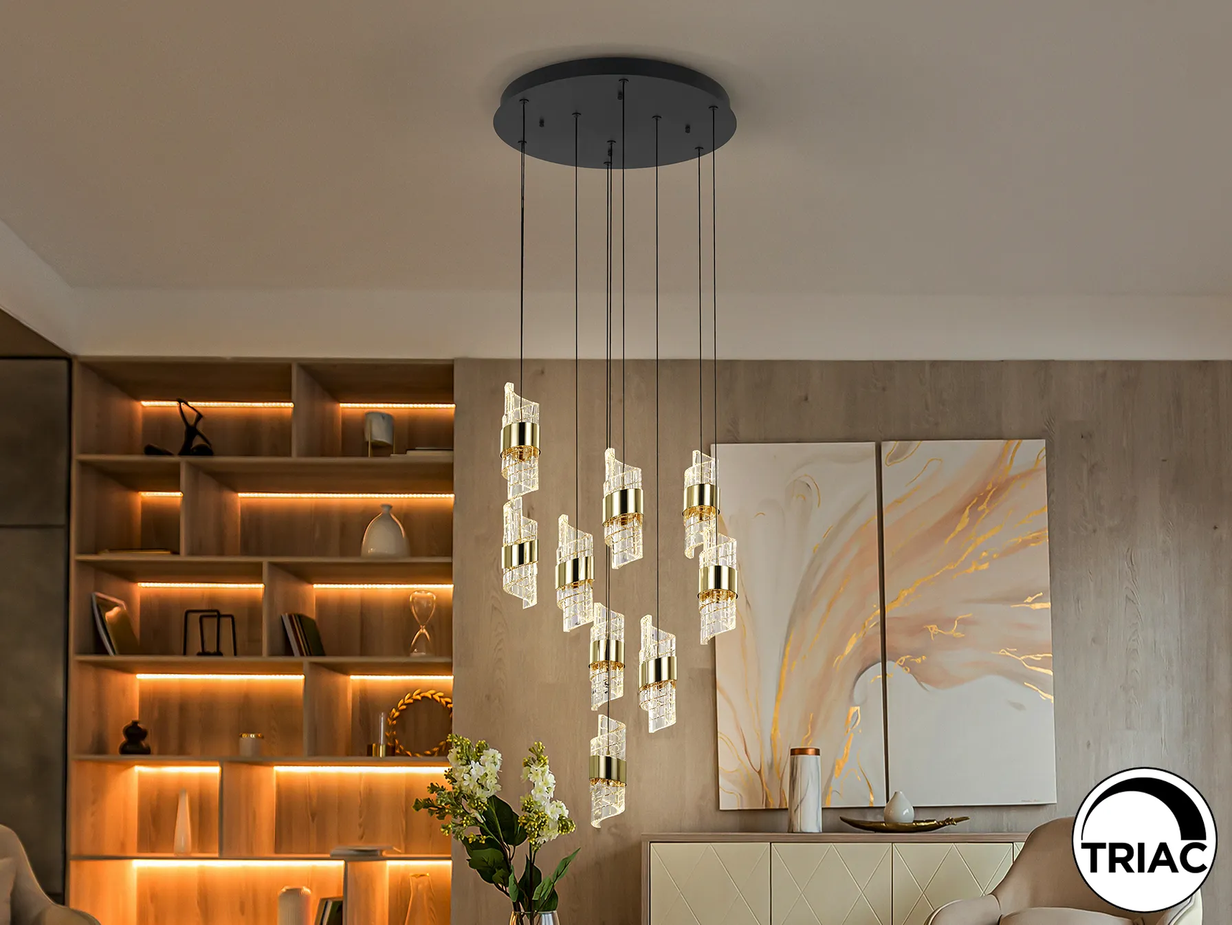 – **Абажури:** Изработени от формован и ръчно изработен акрил с спирална форма