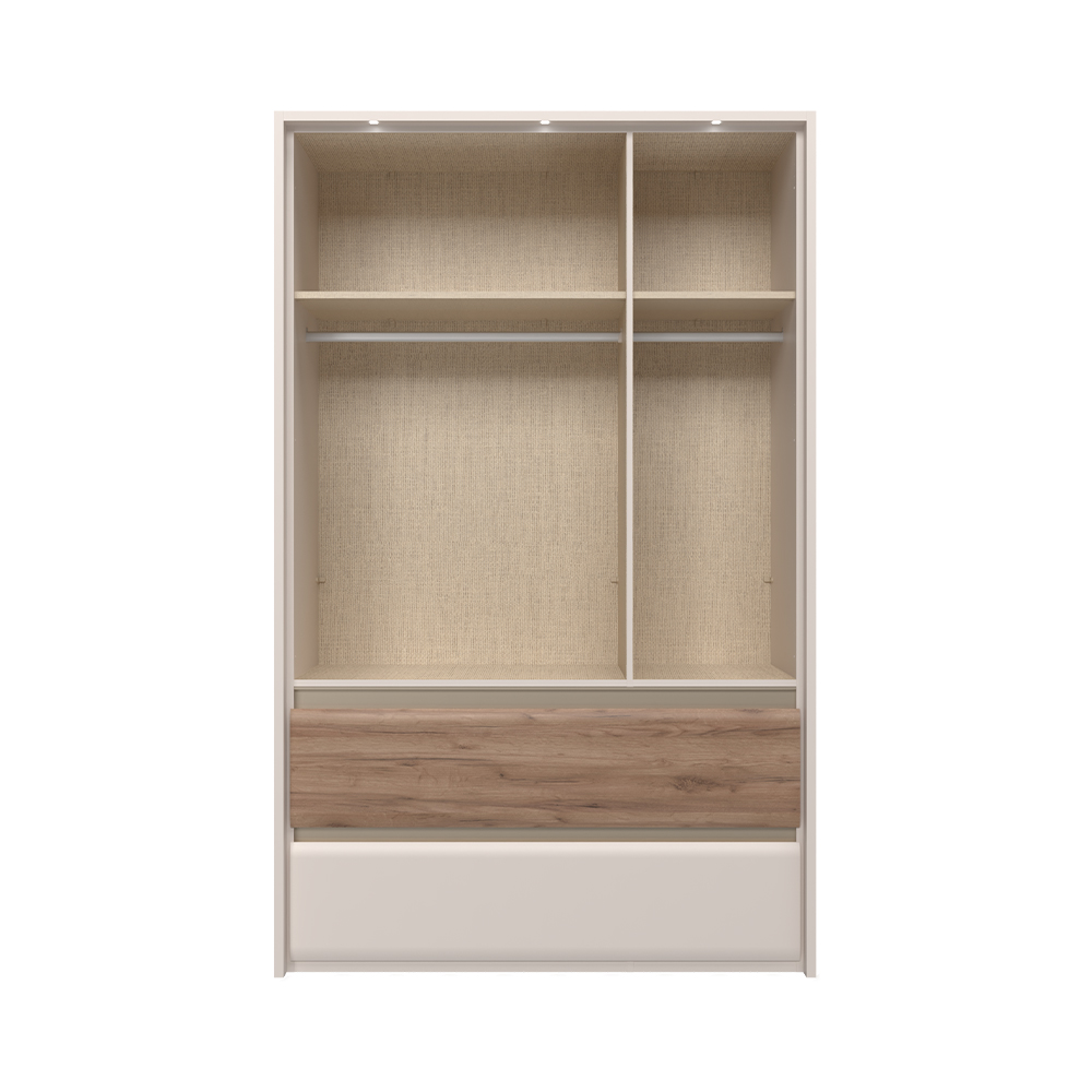 вратите на гардероба са изцяло покрити с водоразтворим UV лак с мек матов ефект в цвят Кашмир, с апликация от профилиран MDF в дървесен декор Тобако дъб