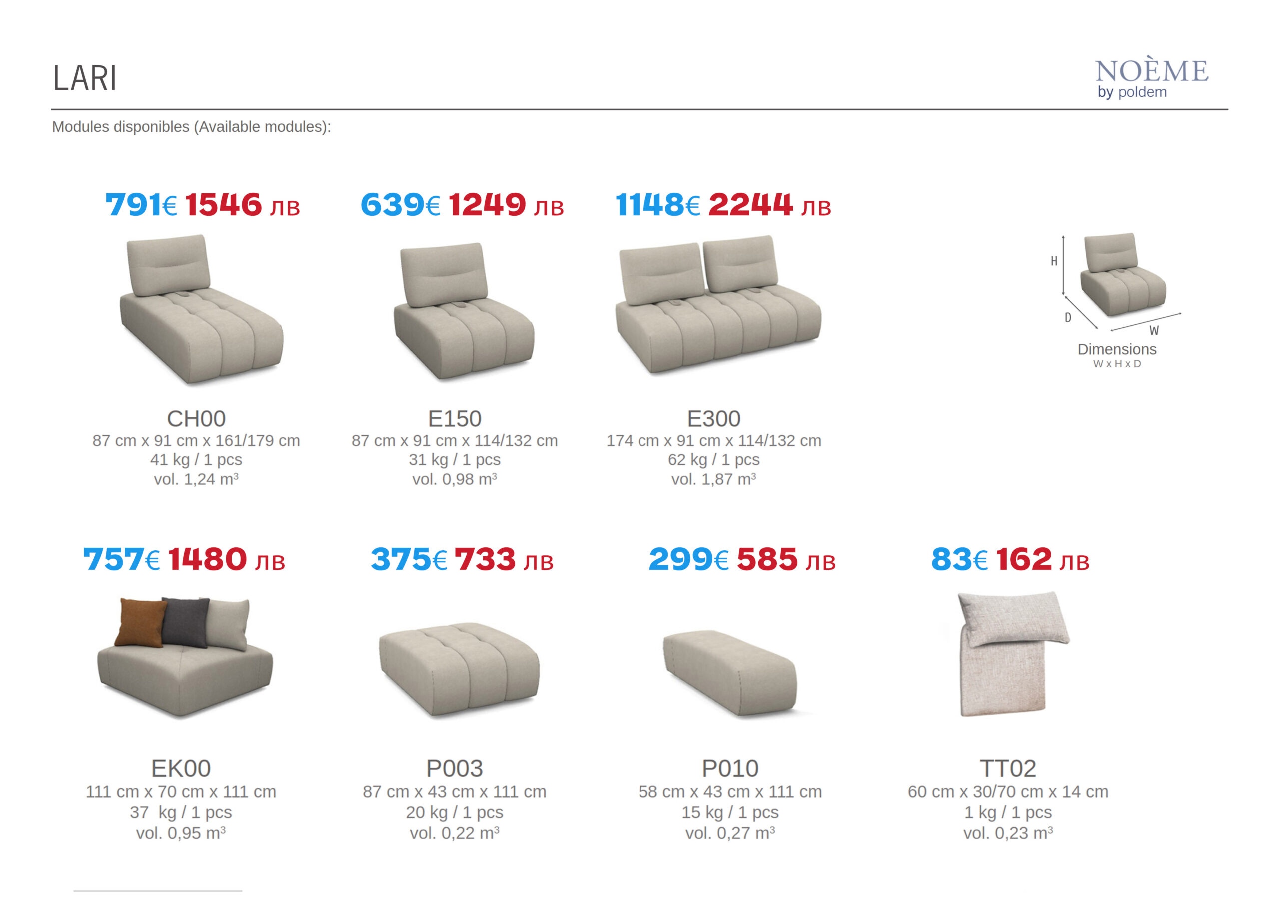 Lari е модулен диван с модерен, изчистен дизайн и изключителен комфорт. Системата от модули позволява лесно сглобяване и пренареждане според пространството и нуждите ти, а crocodile клип системата гарантира стабилно свързване между елементите.