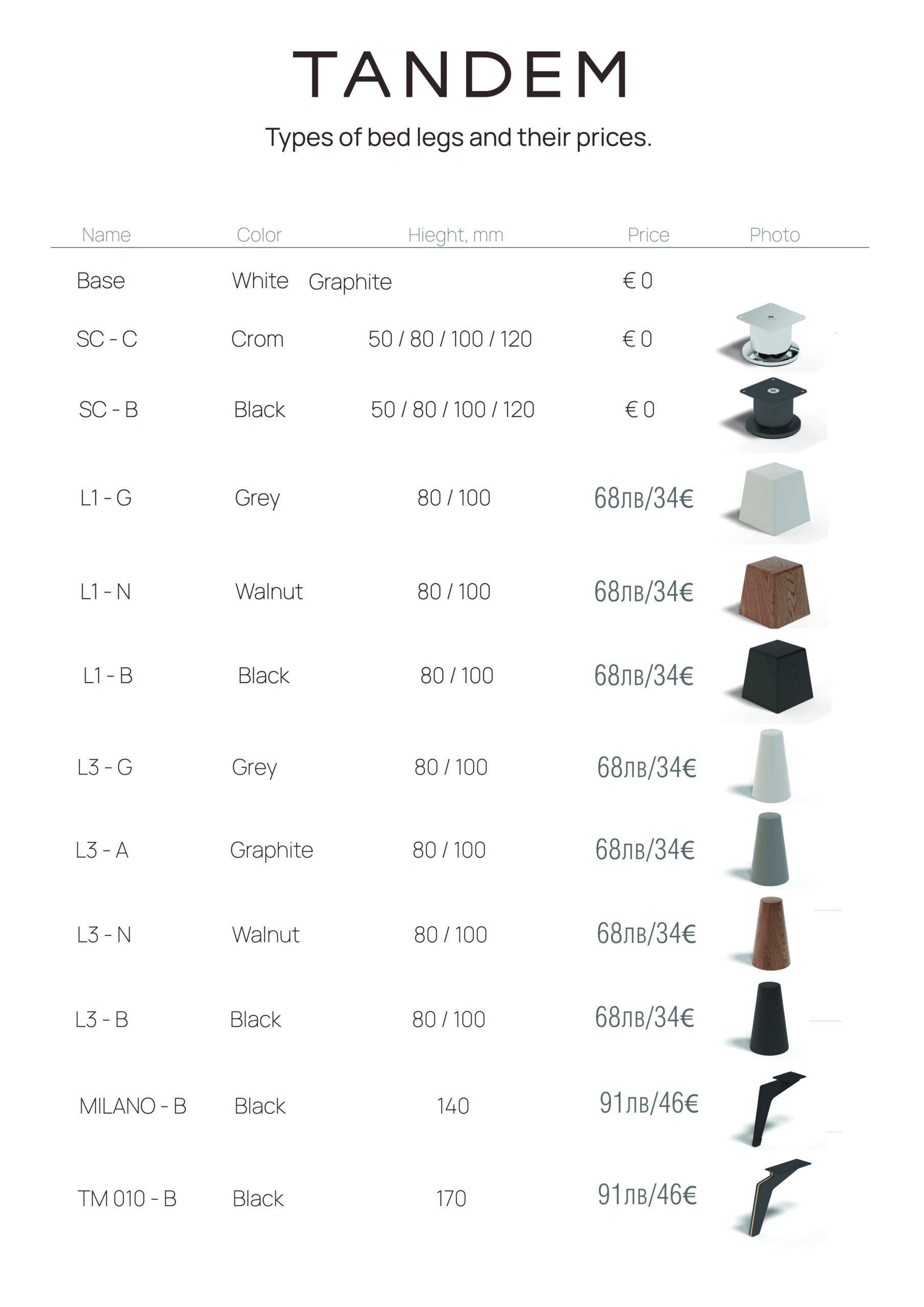 Леглото е в комплект с подматрачна рамка, повдигащ механизъм и разполага с ракла за съхранение на багаж, като вътрешната част може да бъде бяла или графит