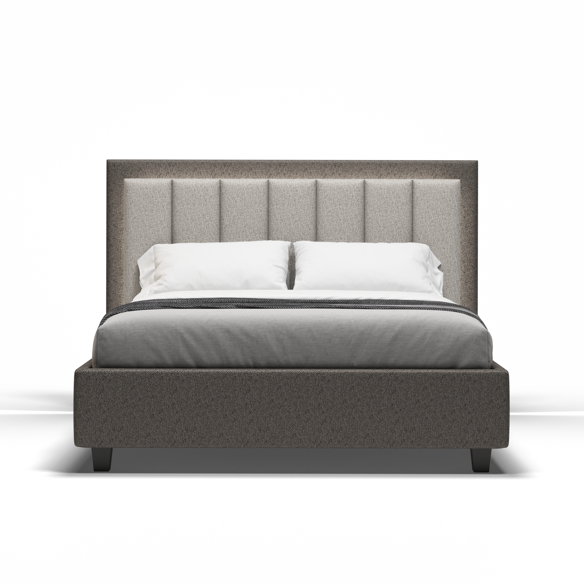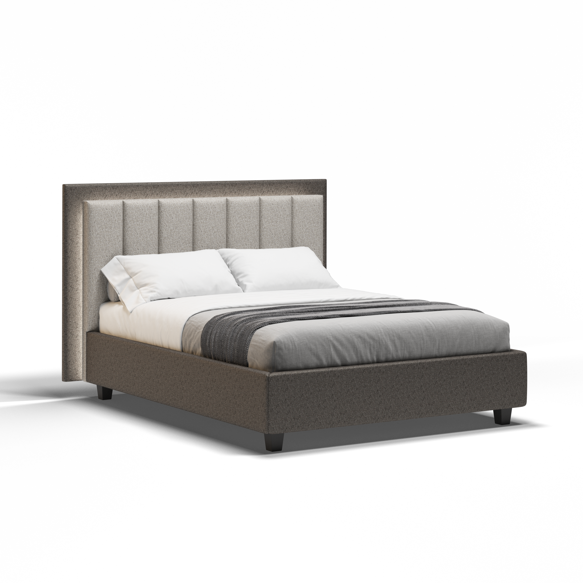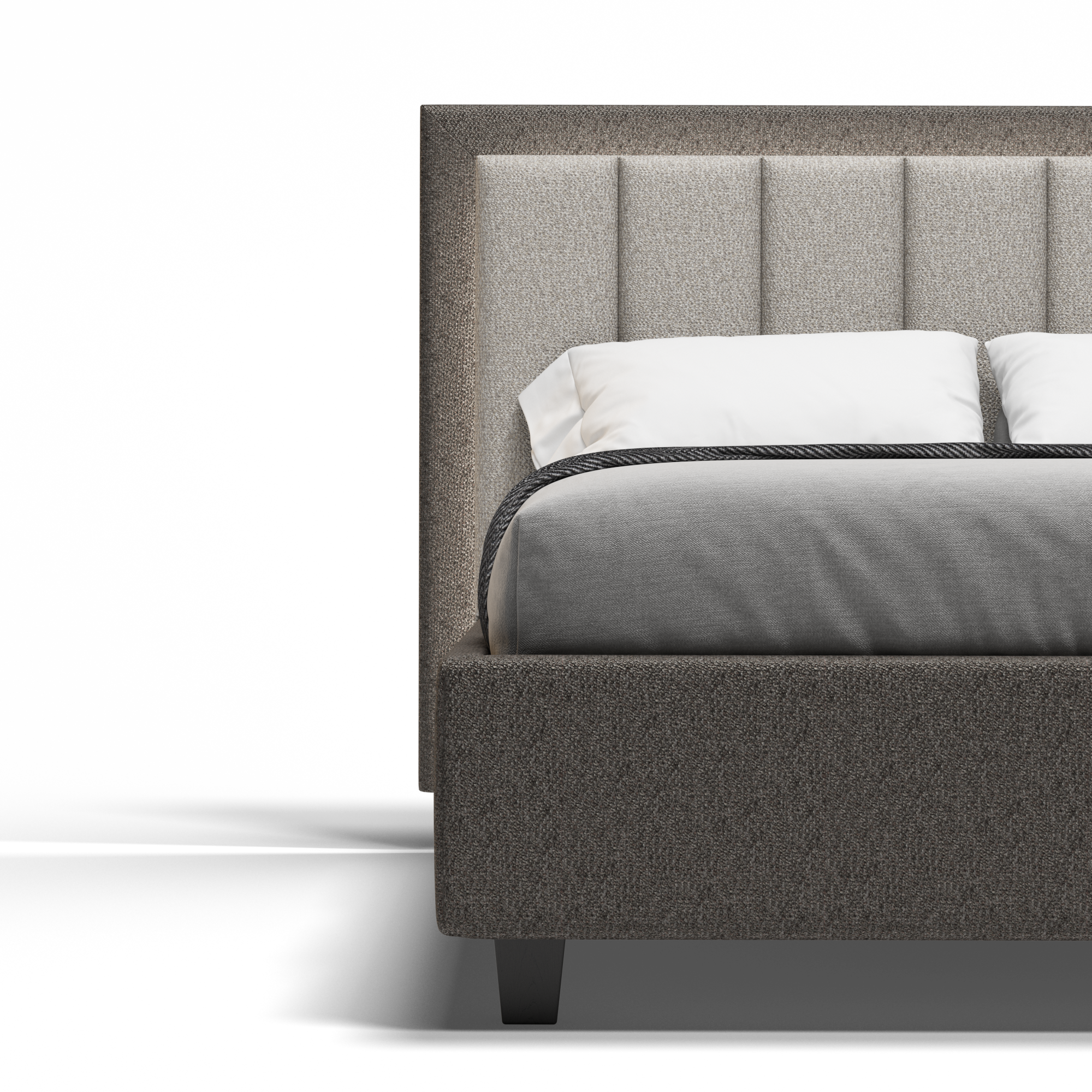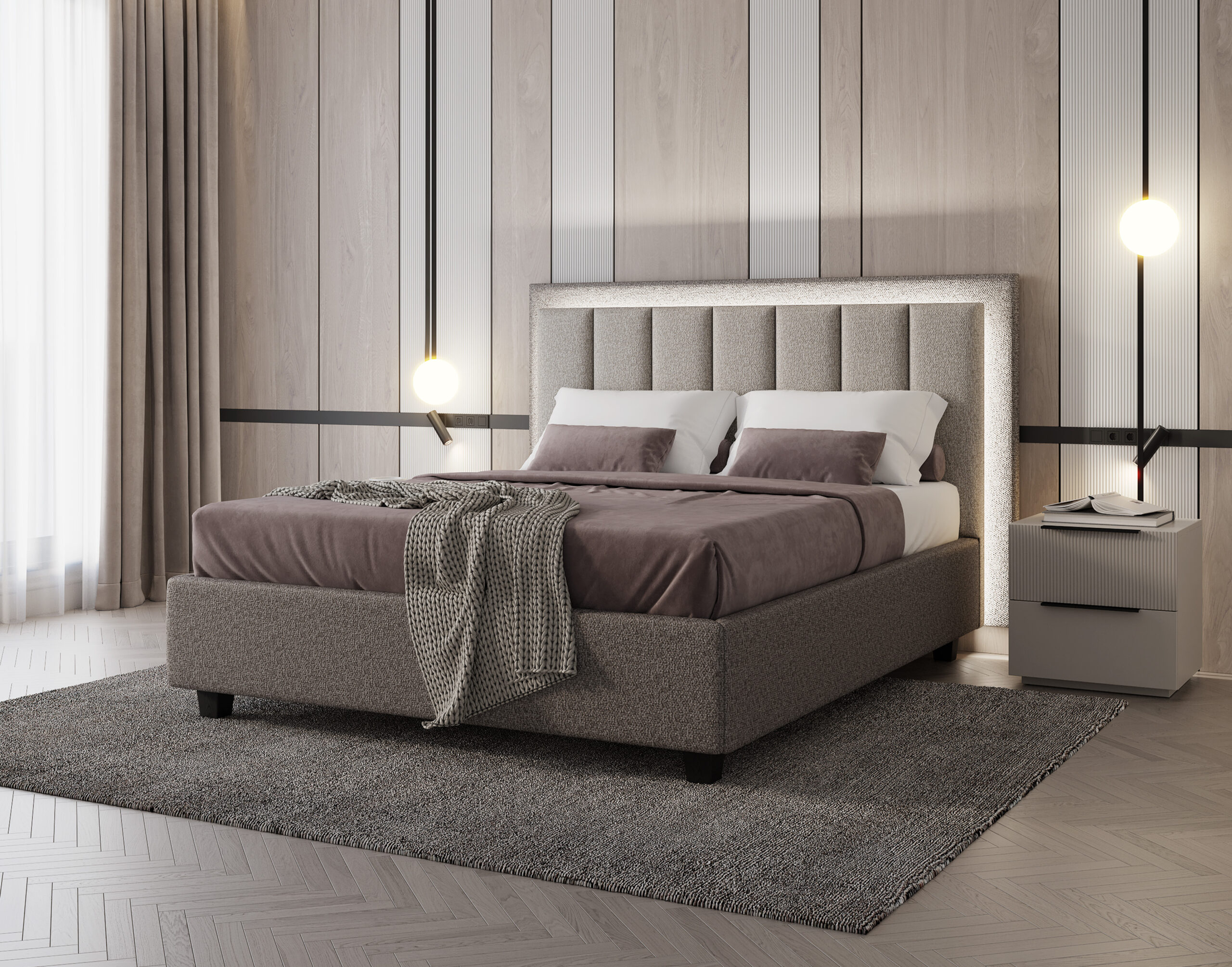 Леглото Silenzio привлича погледа с високата си табла, чийто вертикален ритъм е очертан от фини, равномерни шевове. Просторните му пропорции засилват усещането за ред и височина в помещението, превръщайки стената в графично продължение на вътрешния покой. Таблата, облечена в мек текстил, е създадена не само за естетика, но и за комфорт – като опора по време на четене или почивка. Щедрата ѝ височина и деликатната текстура придават спокойно благородство на цялото пространство.