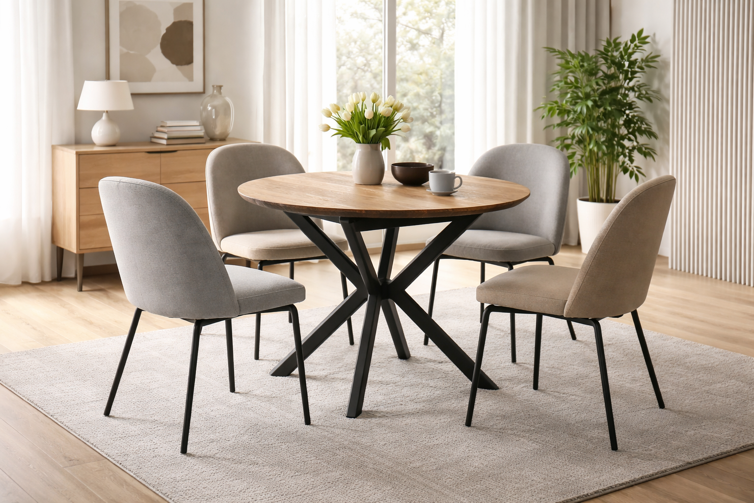 С елегантна визия и удобство, Delta е създадена за съвременния дом. Благодарение на разтегателния си механизъм, масата увеличава диаметъра си от 110 см на 145 см, осигурявайки допълнително място за гости. Плотът от MDF създава уютна атмосфера, а черните метални крака придават модерно и стилно излъчване.