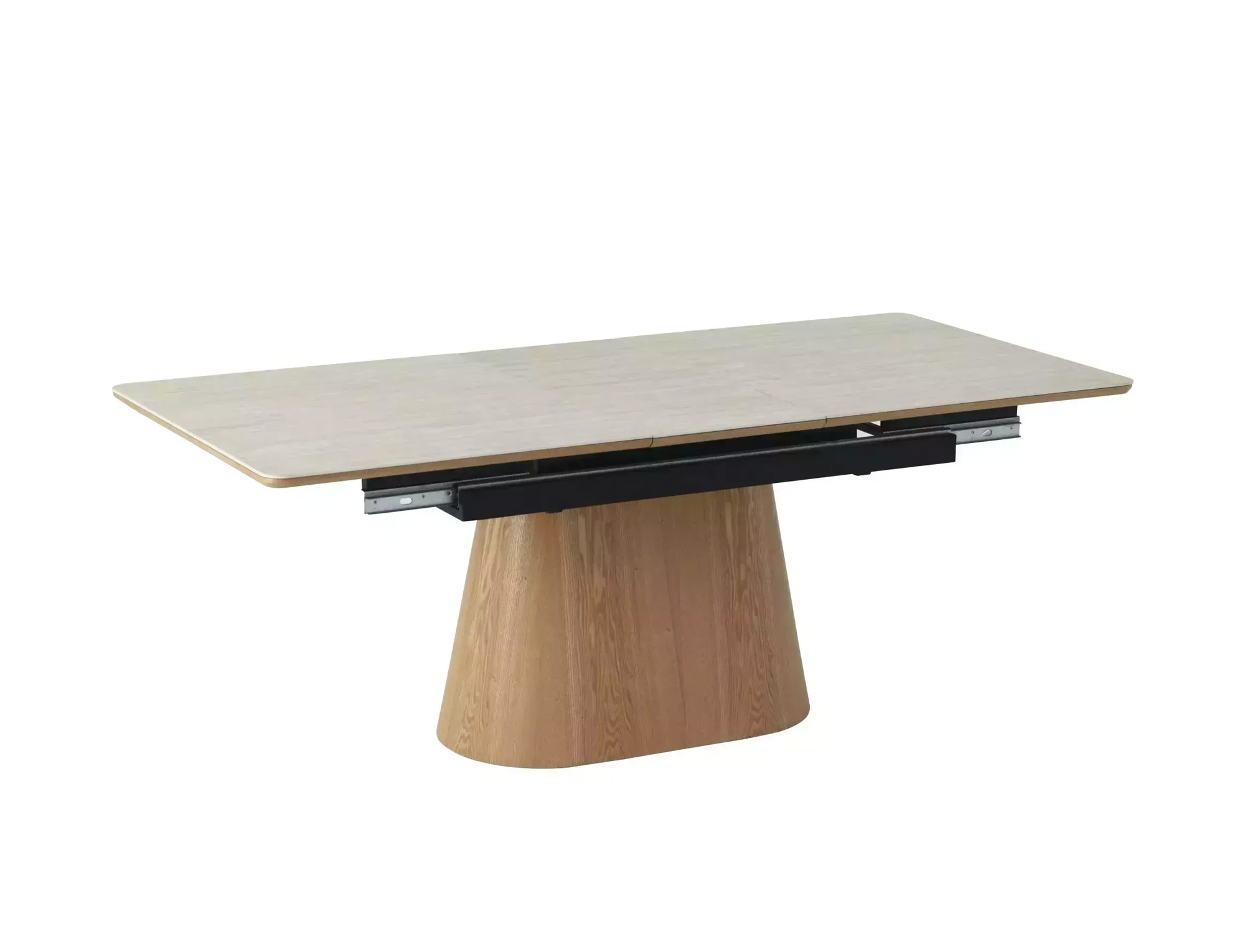 Масата Monaco комбинира елегантна визия и практичност. Плотът от керамика в черен мат или травертин е устойчив на надраскване, топлина и ежедневна употреба, а стелажът от MDF с естествен фурнир в цвят орех или дъб добавя топлина и естествено усещане в интериора.