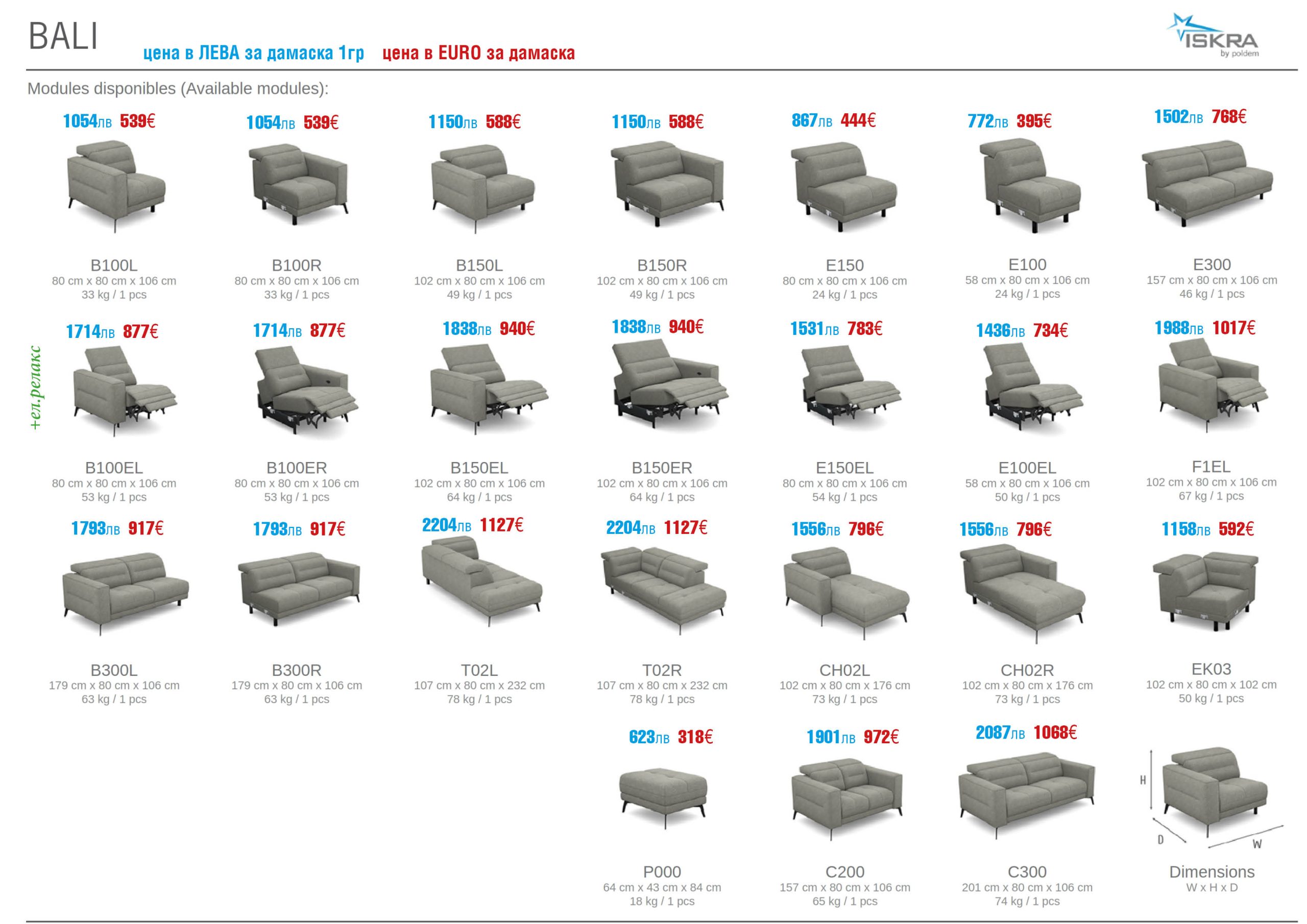 Създайте идеалното си кътче за релакс с модулен диван Bali! Съчетавайки елегантен дизайн и изключителна функционалност, този диван ви дава свободата да го конфигурирате според вашите нужди. Независимо дали търсите уютен ъгъл за почивка или просторна зона за гости, Bali се адаптира към всяко пространство. С висококачествени материи и модерен дизайн, Bali е перфектният избор за всеки дом.