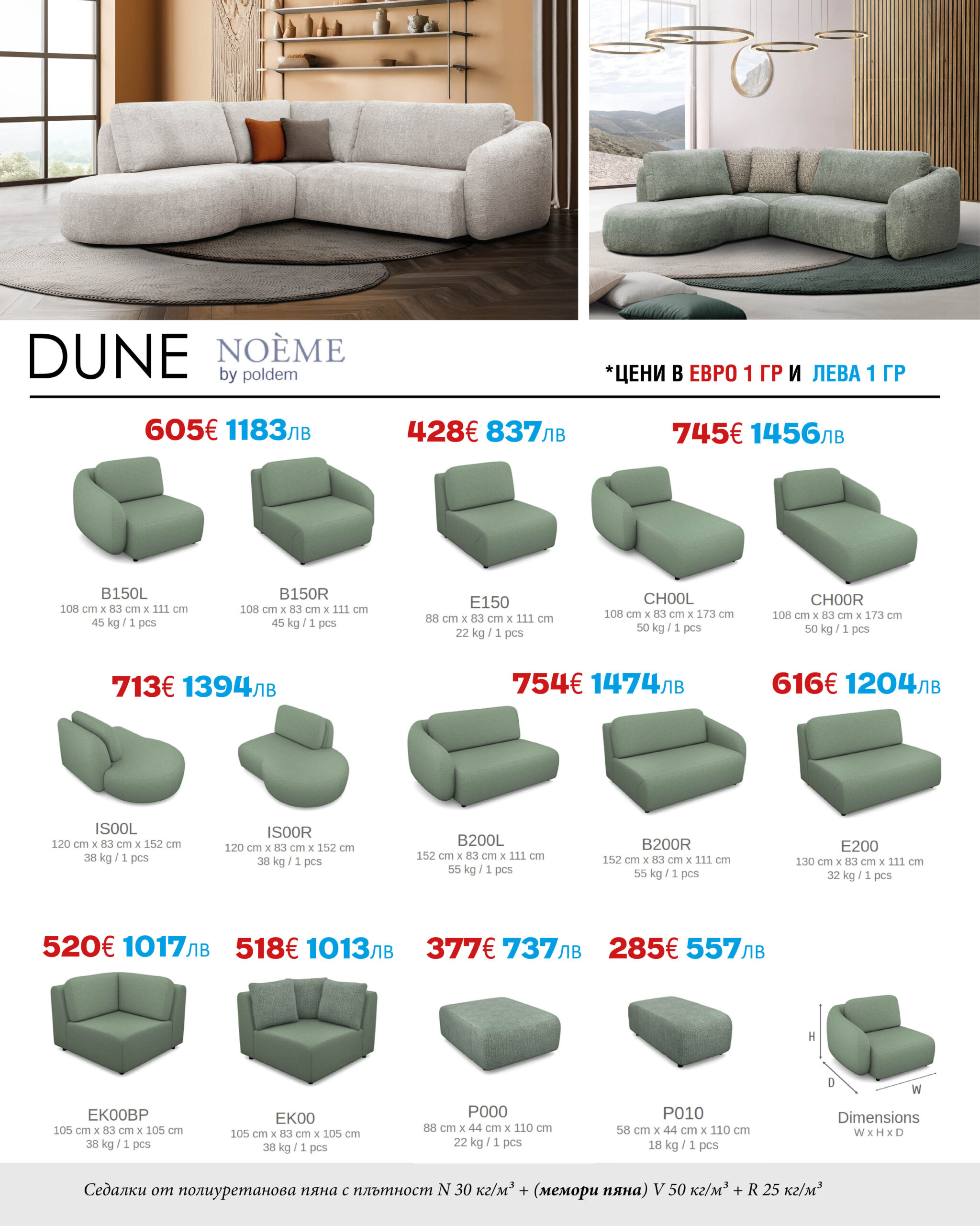 Модулният диван Dune е съвременен и елегантен избор за всяка всекидневна. Създаден с внимание към детайла, той предлага възможността за конфигуриране според нуждите и предпочитанията на потребителя, благодарение на модулната си структура. Диванът е снабден с удобни възглавници и качествени материи, които осигуряват максимален комфорт. Идеален е за съвременни интериори, като съчетава стил, функционалност и дълготрайност..