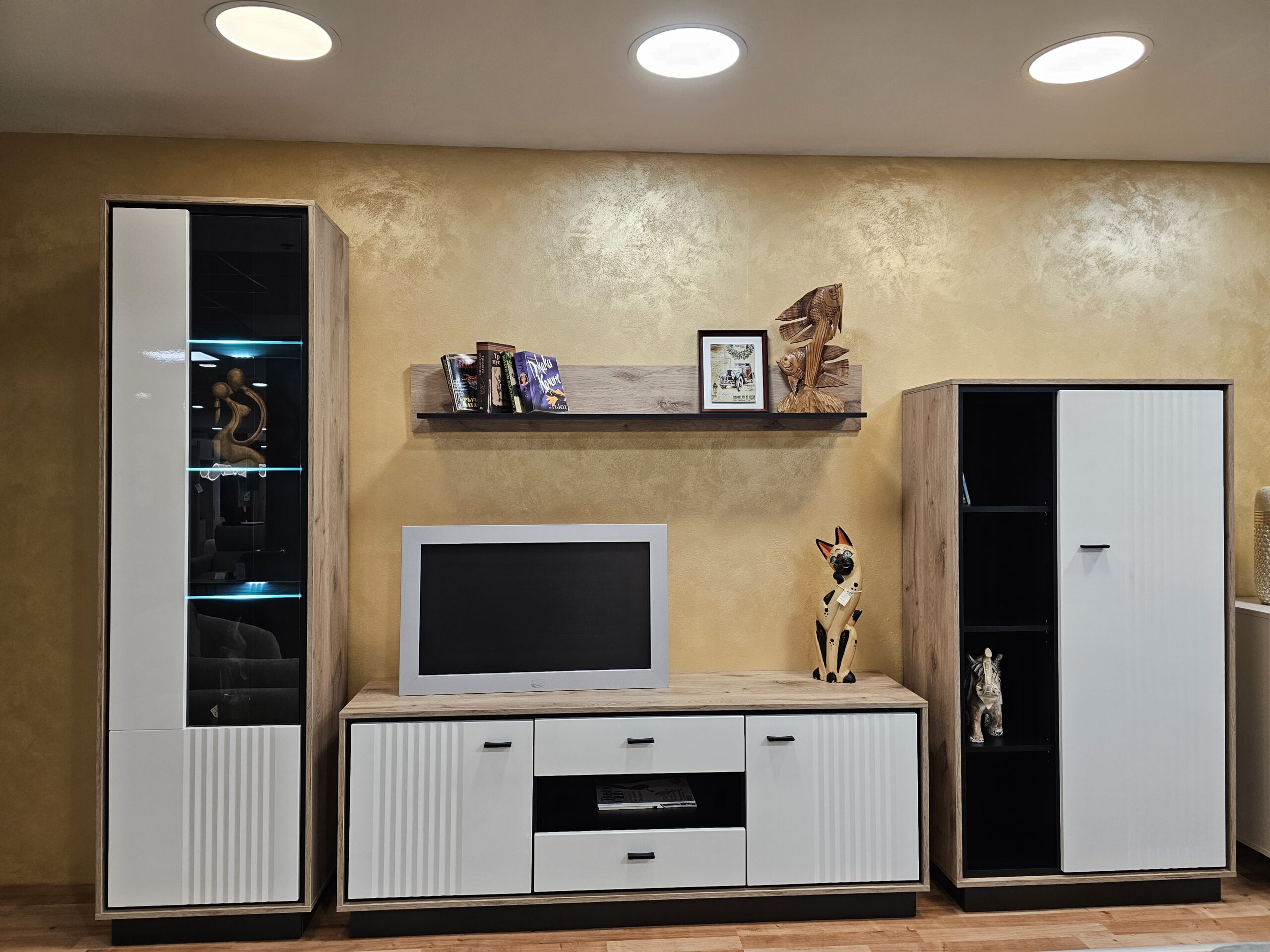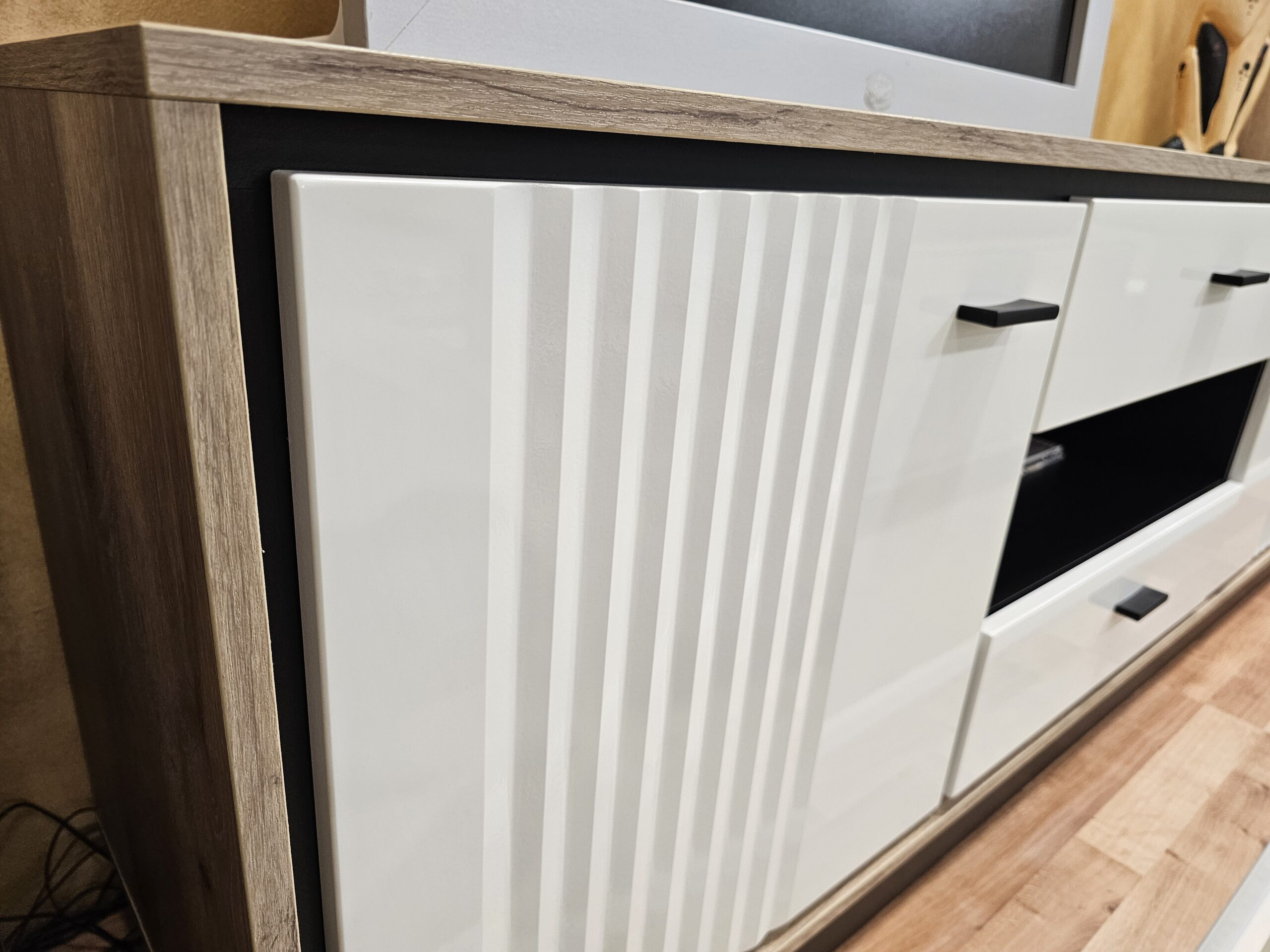 Секция Mestre , която е семпла и изчистена и ще придаде приятен уют в дома ви със съчетанието си от дървесно и бял гланц фолиран MDF с черен корпус и фрезовани вратички.