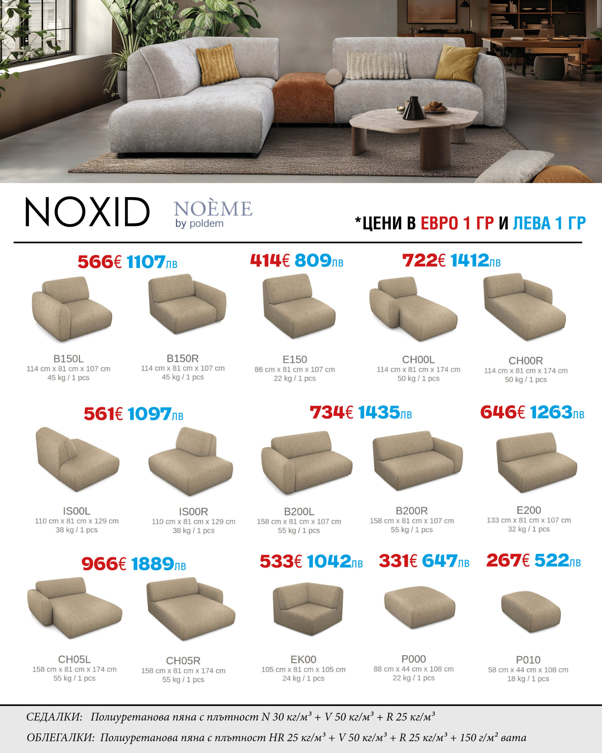 Модулния диван Noxid – гъвкав, стилен и удобен, той ви позволява да оформите своя хол според настроението и нуждите си. Разнообразието от модули ви дава свободата да размествате, разширявате и персонализирате дивана по ваш вкус.