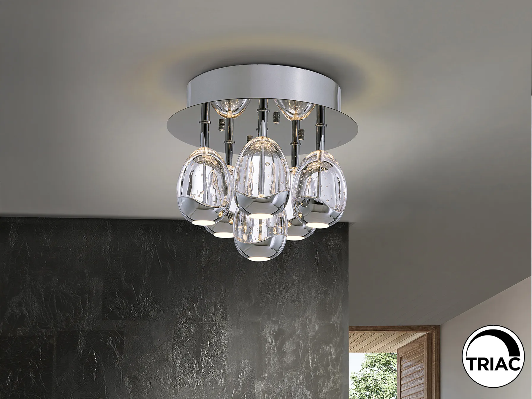 – **Материал:** Хромирана метална конструкция и стъклени абажури