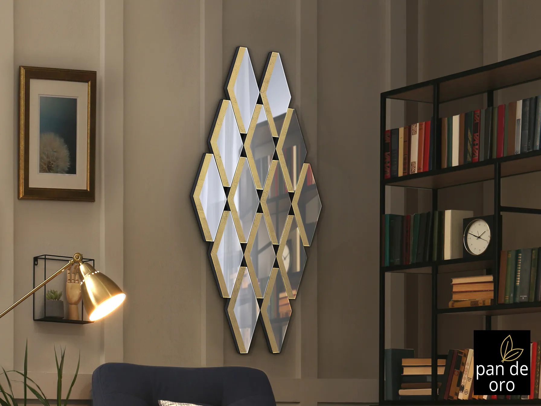 Огледало, оформено от композиция от плоскости с детайли в златен лист. MDF задната част е лакирана в черно и е готово за окачване хоризонтално или вертикално.