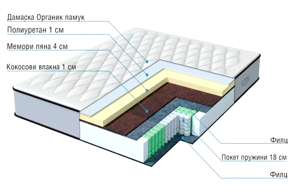 ГОРЕН ЕЛАСТИЧЕН СЛОЙ: Memory Foam 4 см (плътност 50 kg/m³), по избор 6 см за повишен комфорт.