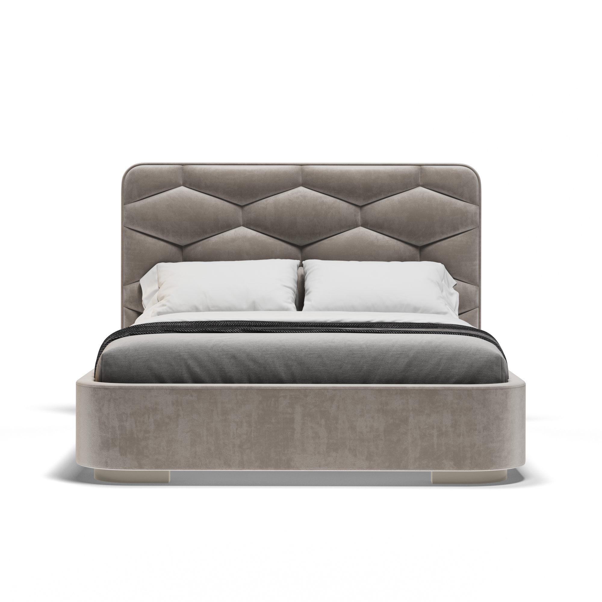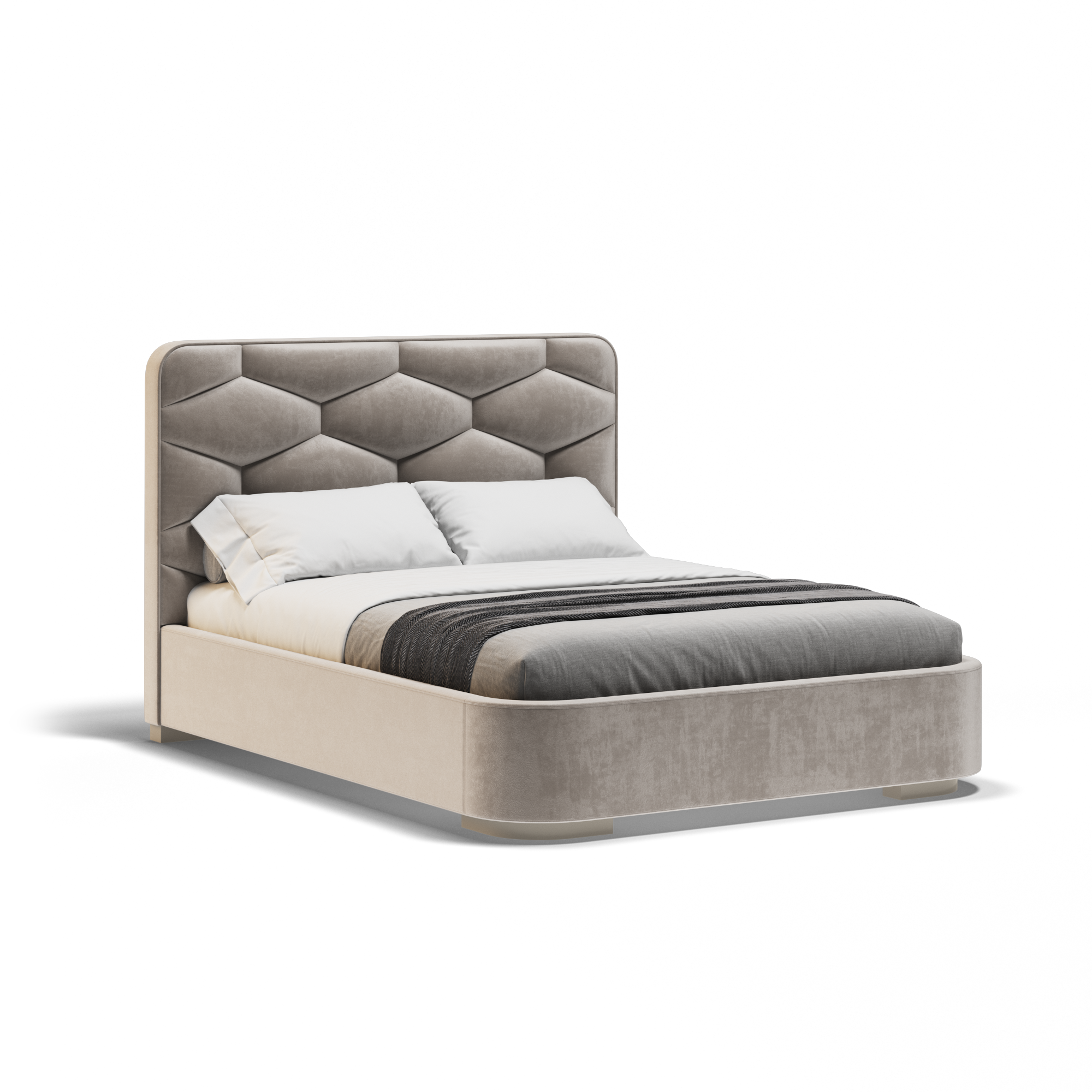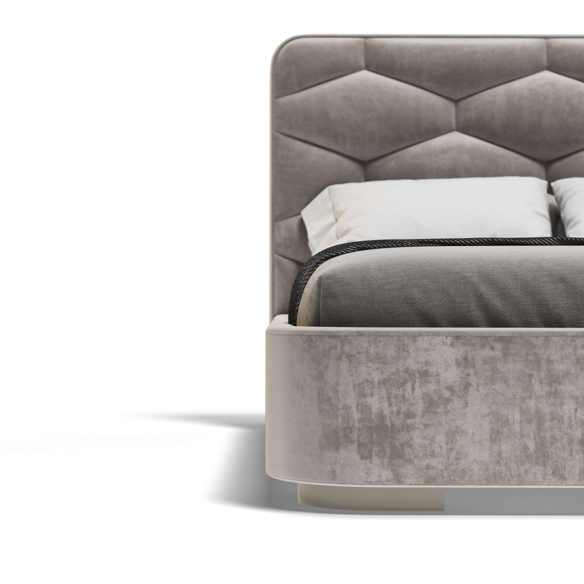 Таблата на леглото е изградена от широки шестоъгълни панели с видимо заоблени ръбове, подредени симетрично, така че създават финa игра на светлина и сянка. Закръглените ъгли на таблата и основата подчертават плавната естетика без остри линии — идеално решение за лек, елегантен и уютен интериор.
