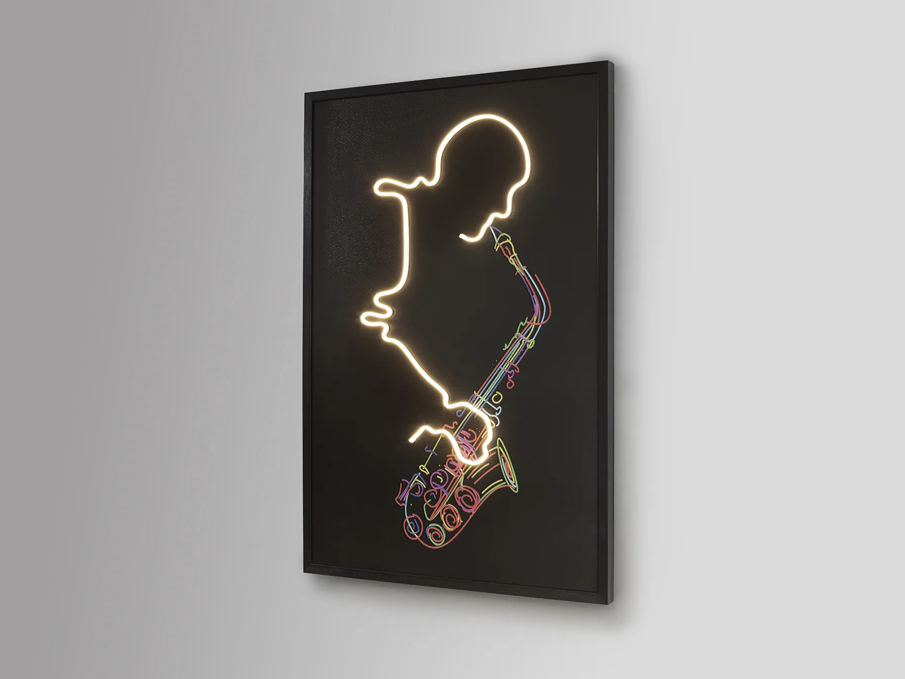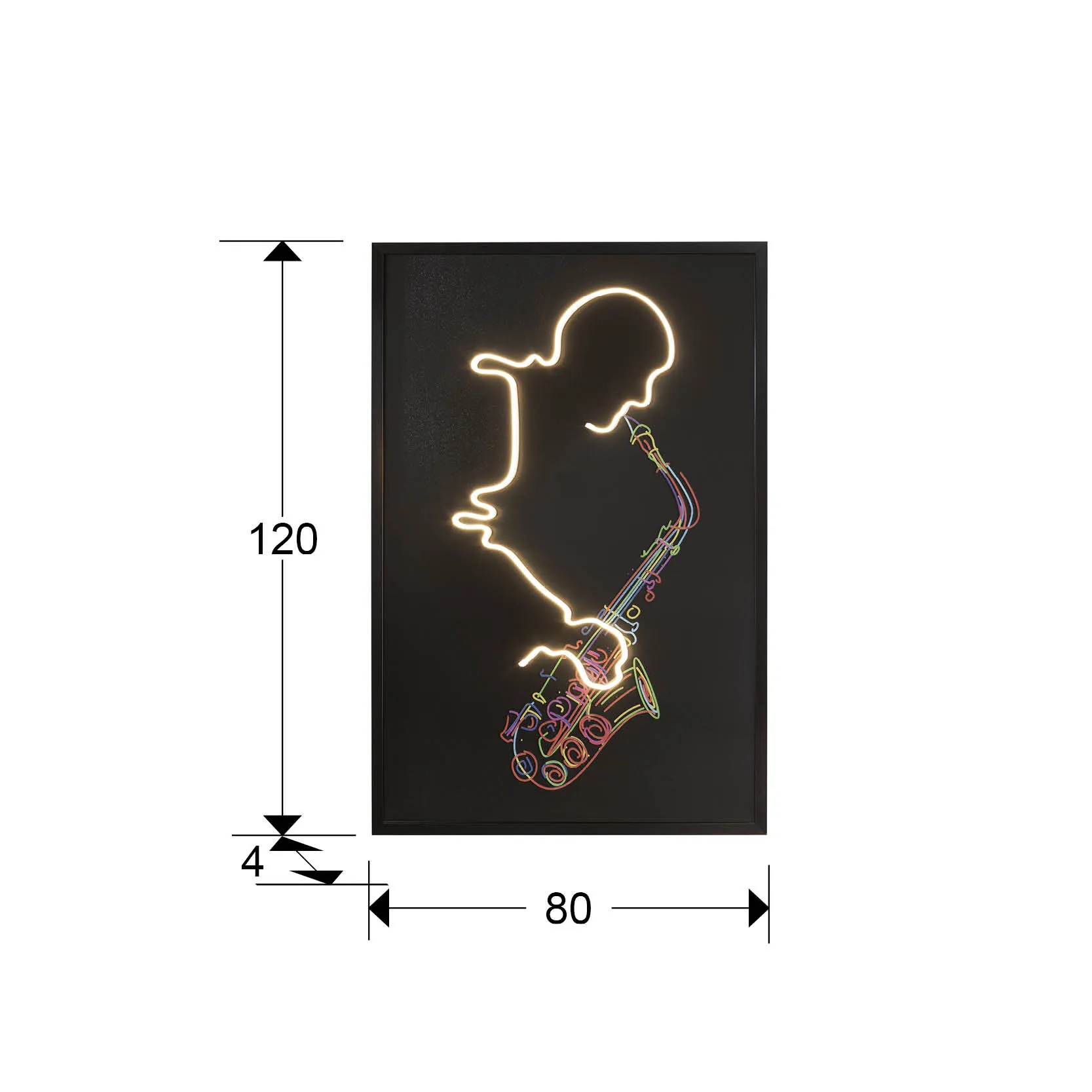 Тази уникална светеща картина представя линия на музикант със саксофон и е идеално допълнение за любителите на музиката и изкуството. Със своето съвременно оформление, тя ще освети всяка стая и ще създаде уютна атмосфера.