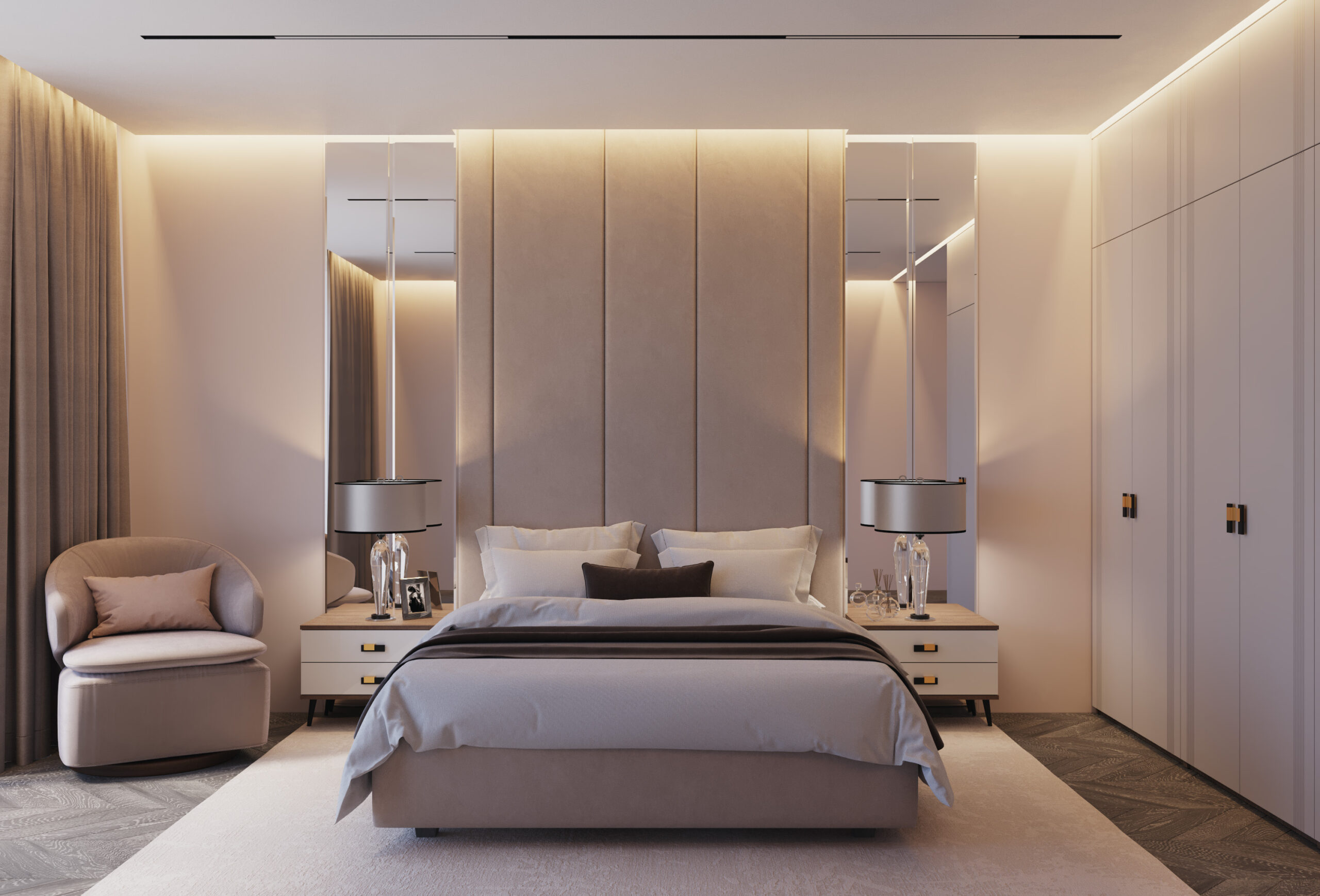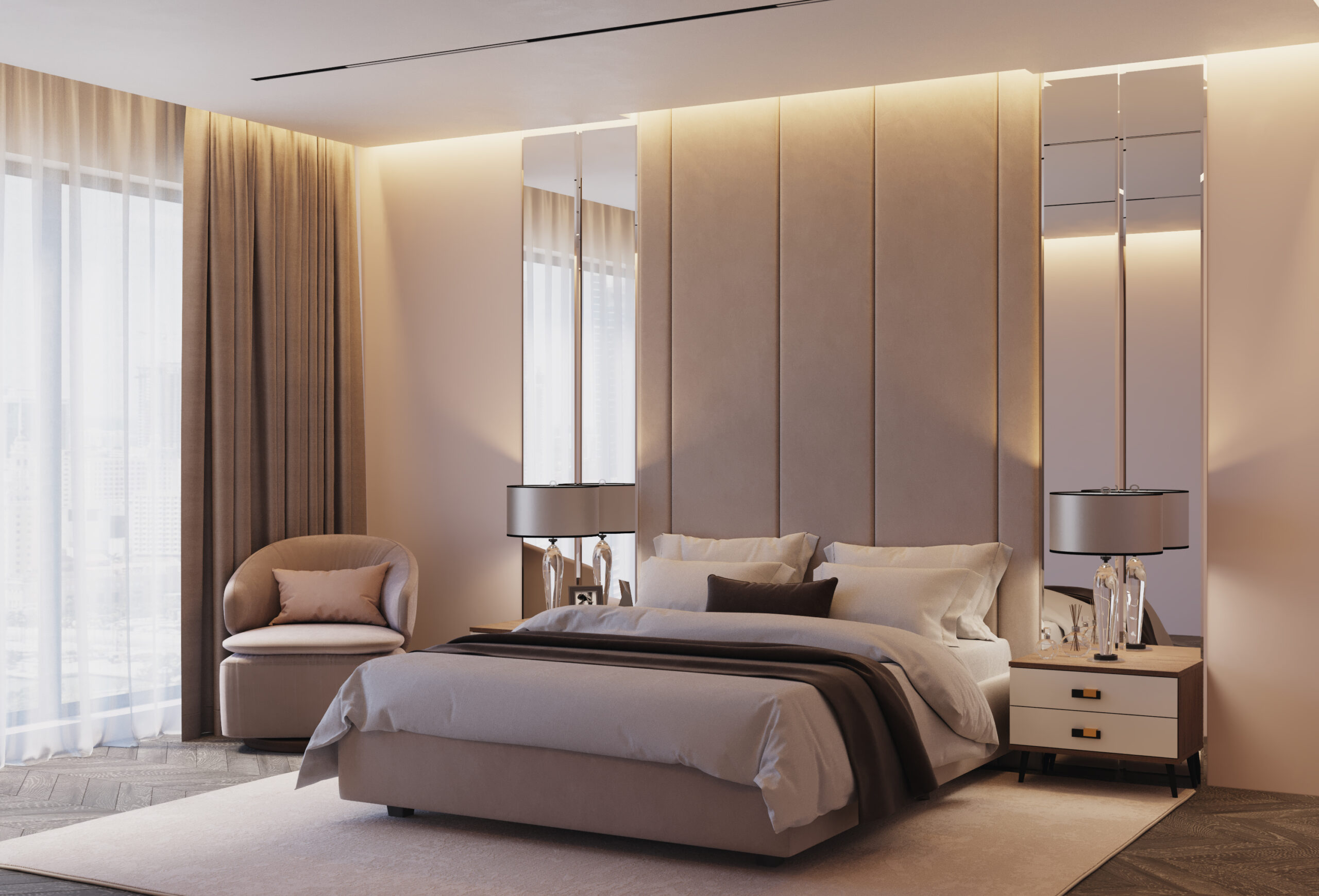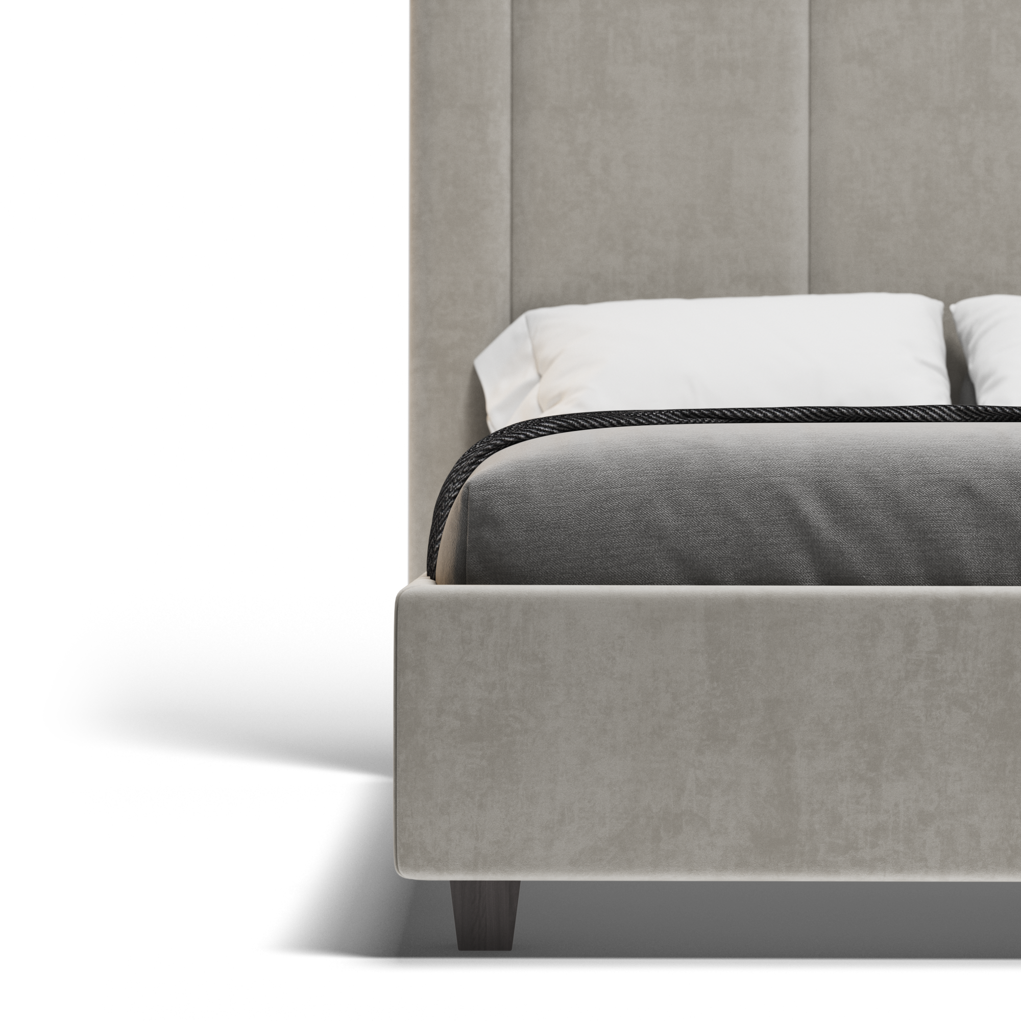 Централният елемент на леглото Sky е неговата впечатляваща табла – много висока, съставена от широки вертикални панели, разположени на прецизни разстояния. Чистият, симетричен дизайн и внушителните пропорции създават усещане за архитектурна вертикалност и добавят елегантен драматизъм в спалнята. Това е идеален избор за големи, добре осветени пространства, в които доминиращите елементи са добре дошли.
