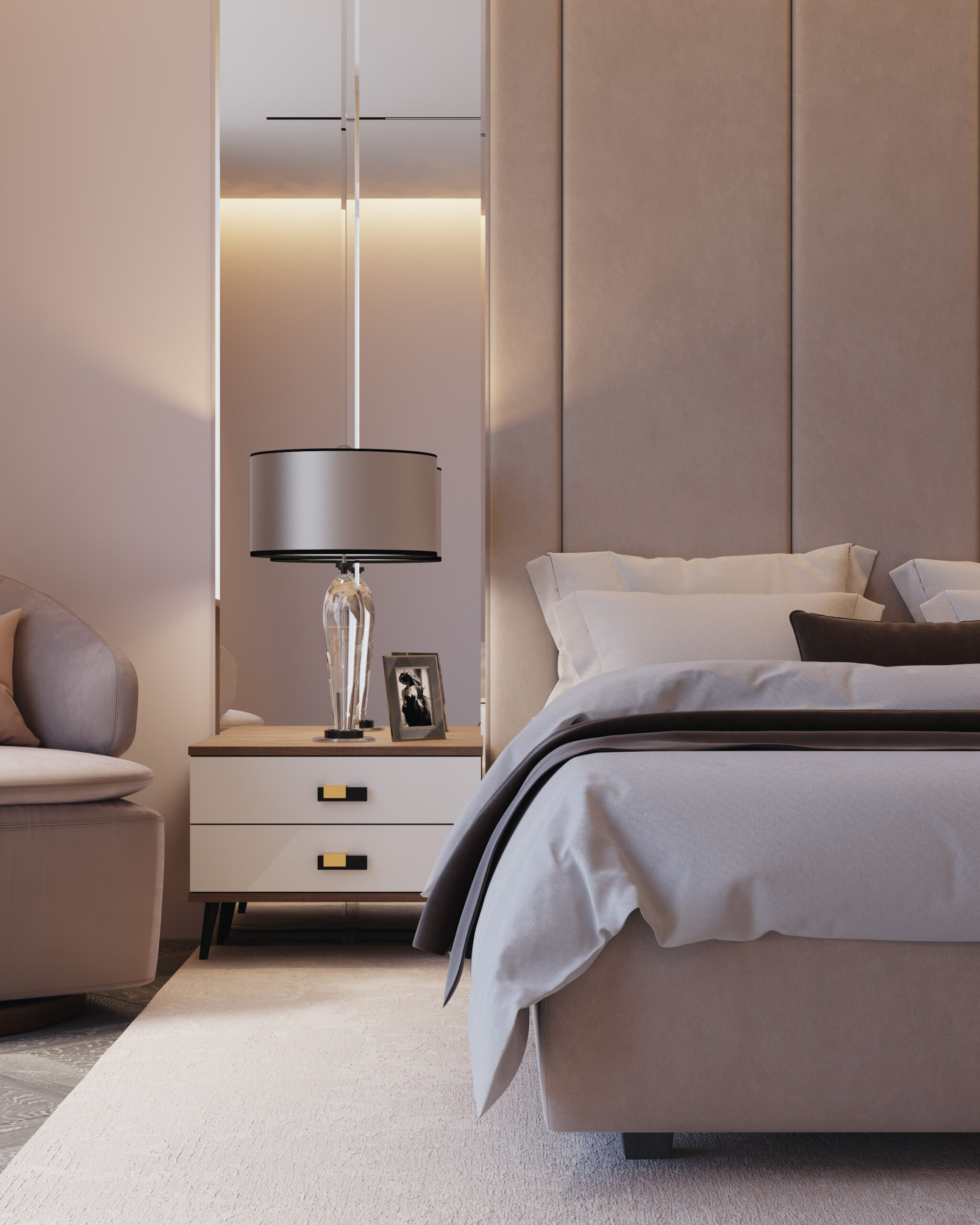 Рамката на леглото, изработена от ПДЧ, обхваща дизайн с прави ъгли и е покрита с гладка материя, а страничната покривка може да остане здраво закотвена или да се свали за лесна хигиена. Имайки предвид специалната атмосфера, която искате да създадете във вашето лично пространство, можете да изберете да интегрирате осветителна система.