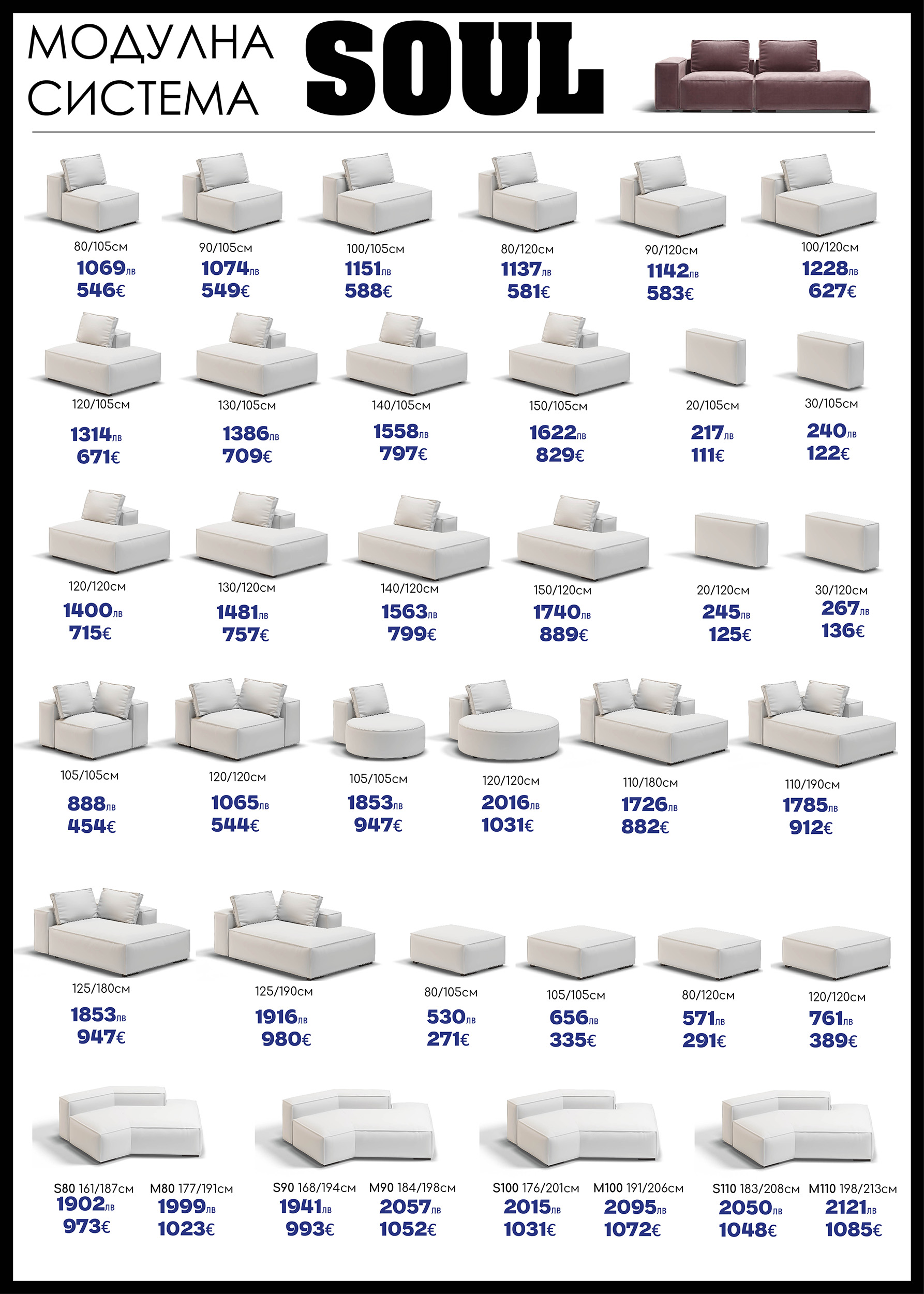 С нисък силует и заоблени форми, Soul не доминира в пространството, а го допълва с баланс и яснота. Независимо дали е поставен в отворен хол или в по-интимна зона за почивка, той запазва своето спокойно излъчване и добре изразена структура. Възможността за различни конфигурации – ъглов, островен или прав – го превръща в адаптивно решение за интериори с характер.