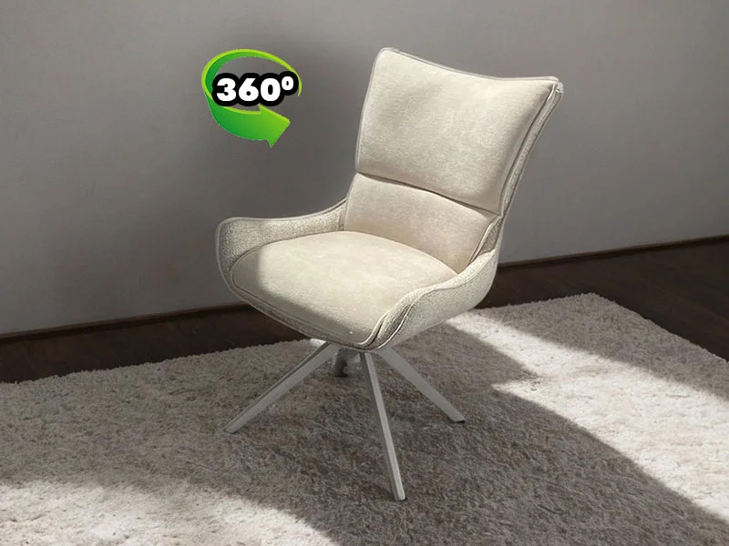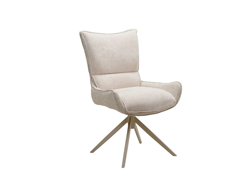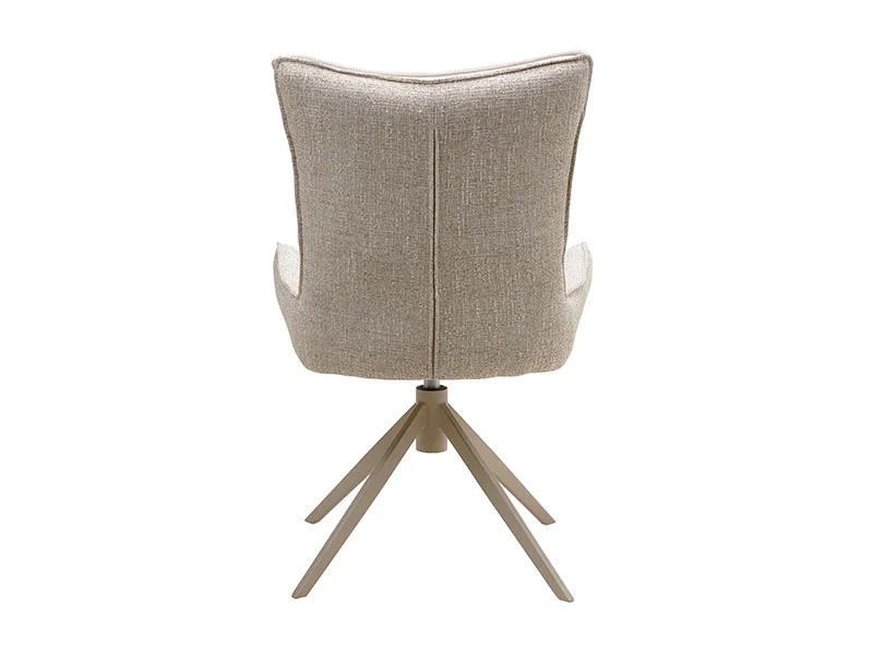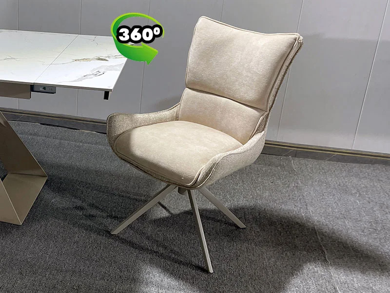 Съвременен стол с въртяща се на 360 градуса седалка. Основата е изработена от метал и боядисана в стилен цвят таупе (сиво-бежов). Седалката е тапицирана с два различни плата в бежови нюанси – външната част е от текстил тип тъкан, а вътрешната – от мек микрофибър.
