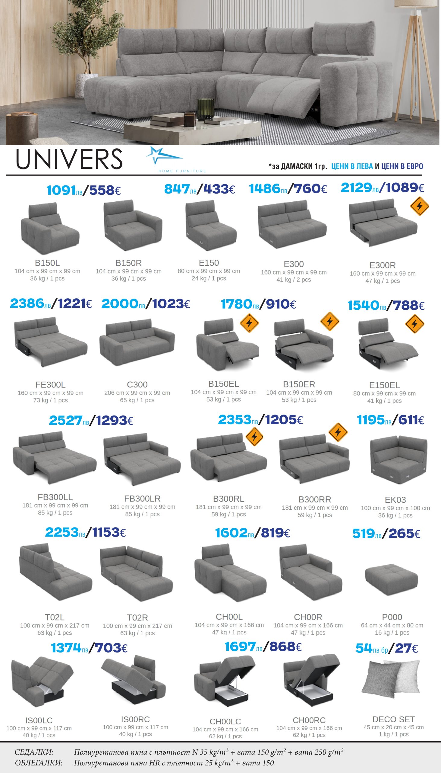 Univers е модулен диван, който комбинира изчистен дизайн и безкомпромисно удобство. Благодарение на разнообразните модули можете да създадете конфигурацията, която най-добре отговаря на вашето пространство и стил – от компактни решения до просторни ъглови композиции.