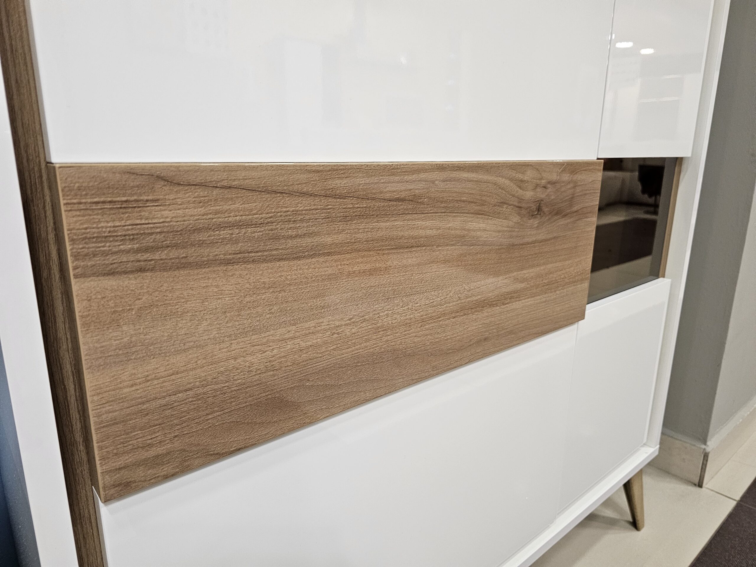Предната част на шкафа е комбинация от висок гланц в кристално бяло, 25 мм дебел декоративен елемент в декор Pacific walnut и атрактивно стъкло stopsol с дебелина 4 мм.