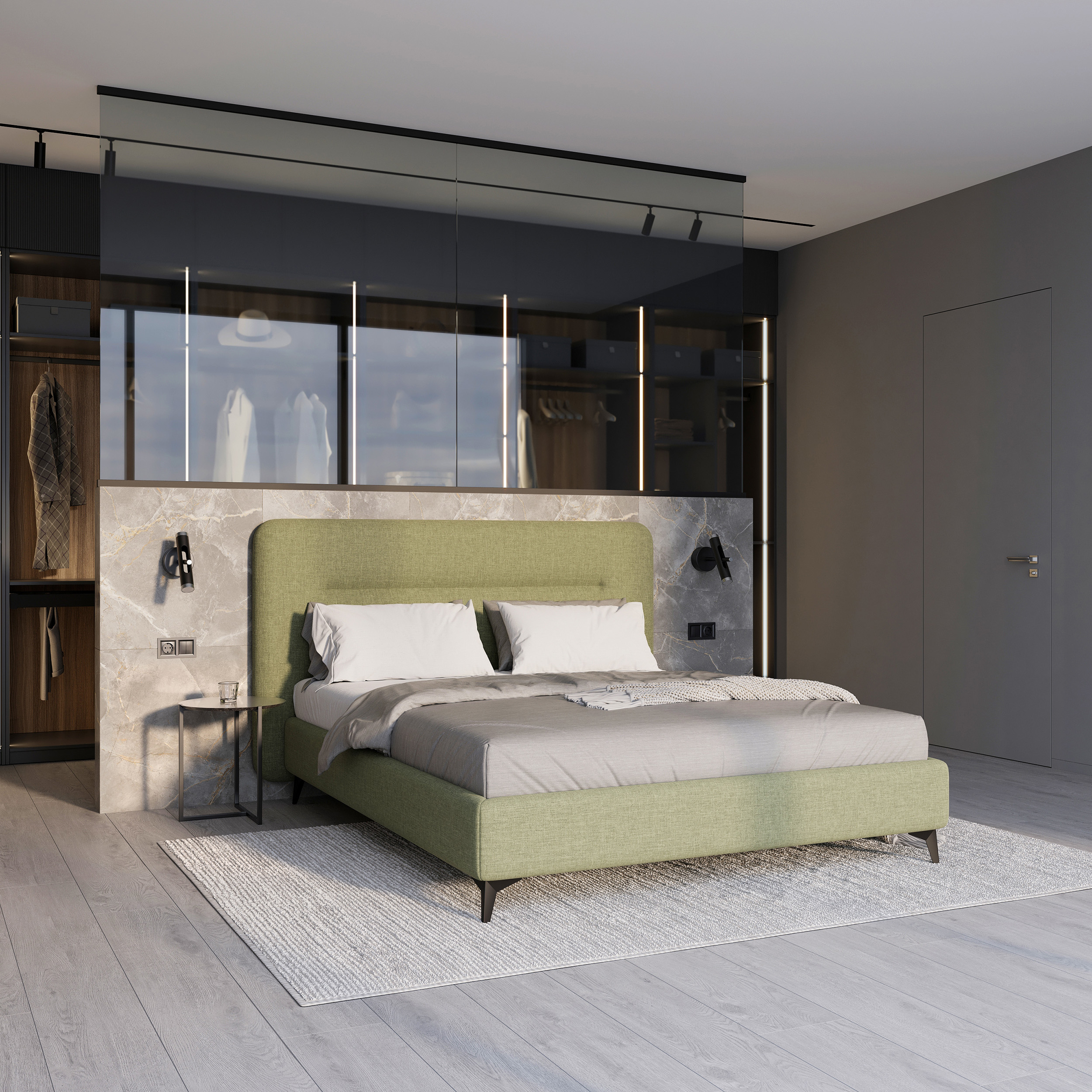 Леглото впечатлява със стилната си табла, капитонирана с хоризонтална линия, която създава усещане за простор и елегантност.