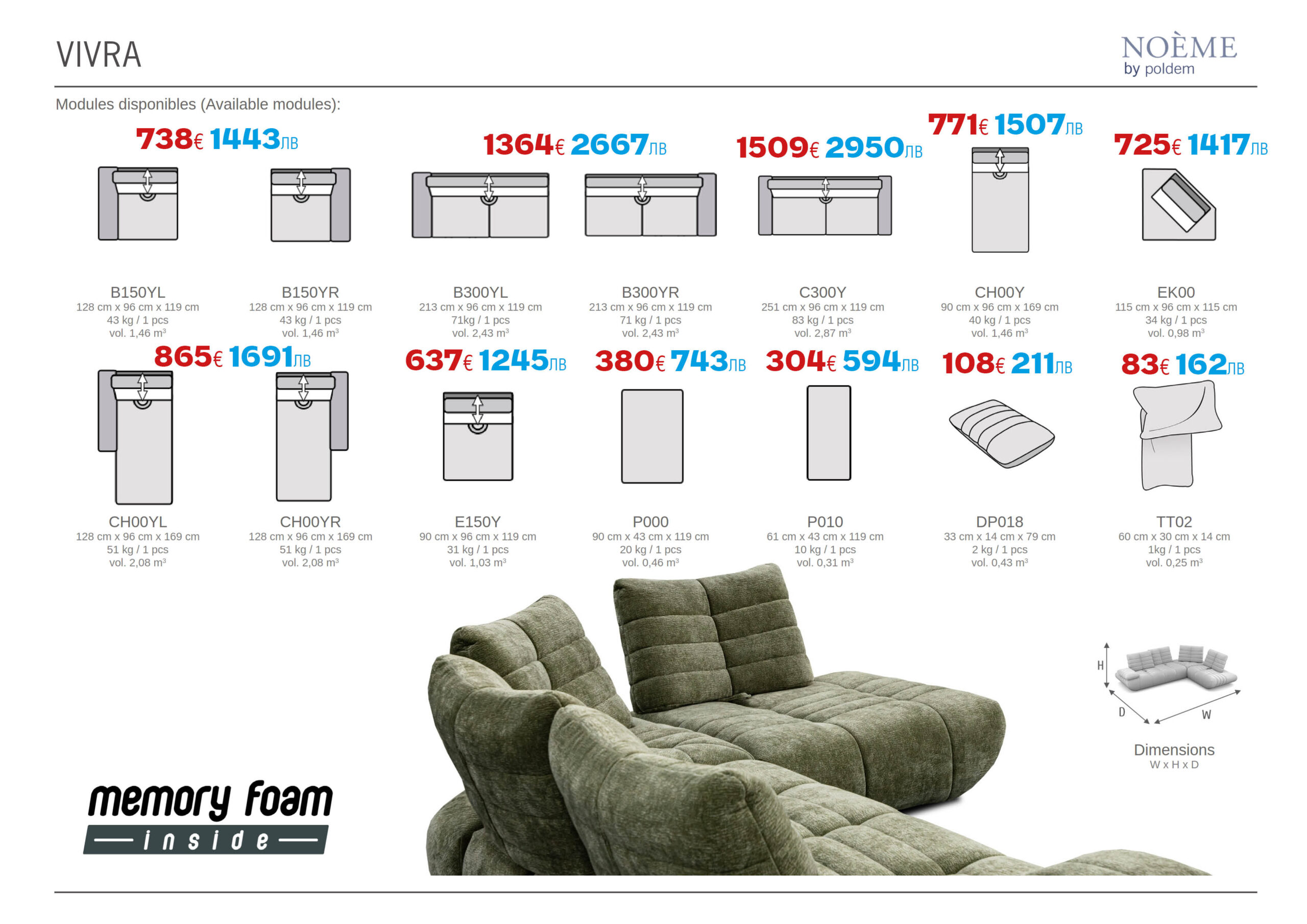 Модулният диван Vivra съчетава стилен дизайн с превъзходно усещане за уют и комфорт. Седалките с висококачествена полиуретанова пяна и Мемори Пяна създават оптимална мекота и адаптация към тялото, а зиг–заг пружините осигуряват идеална опора и дълготрайност. Облегалките са проектирани с грижа за гърба, а здравата конструкция от дървесни плочи и масив дърво гарантира стабилност за години напред. Ръчен механизъм позволява местенето на облегалките според вашето удобство.